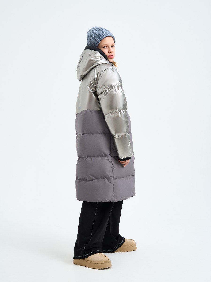 Утепленное зимнее стеганое пальто прямого свободного силуэта с втачным рукавом. Верх изделия выполнен из ткани с благородным матовым блеском. Верхняя часть подклада изделия выполнена из флиса и обеспечивает надежную защиту от холода. Втачной капюшон с высокой горловиной надежно защищает от ветра и снега. Край капюшона с кулисой, регулируемой шнуром-резинкой и стопорами. По низу рукава эластичный трикотажный манжет с прорезью для большого пальца также обеспечивает сохранение тепла. На левом рукаве светоотражающая нашивка с фирменным логотипом. Застежка центральная на молнию с оригинальным черным пуллером и ветрозащитной планкой, застегивающейся на кнопки. Боковые карманы с листочкой застегиваются на молнию с контрастным пуллером черного цвета. Ширина низа изделия регулируется с помощью эластичного шнура. Вся наша продукция сертифицирована и соответствует высочайшим стандартам качества, наша компания является участником программы "Бережливое производство" серый