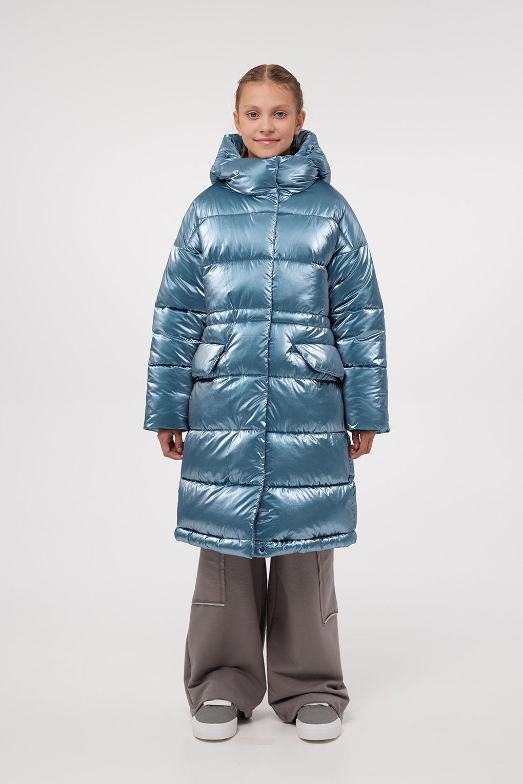 Капюшон несъемный,втачанный в воротник. Край капюшона-с кулисой, регулируемой шнуром-резинкой и стопорами. По низу изделия регулируемая кулиса.
