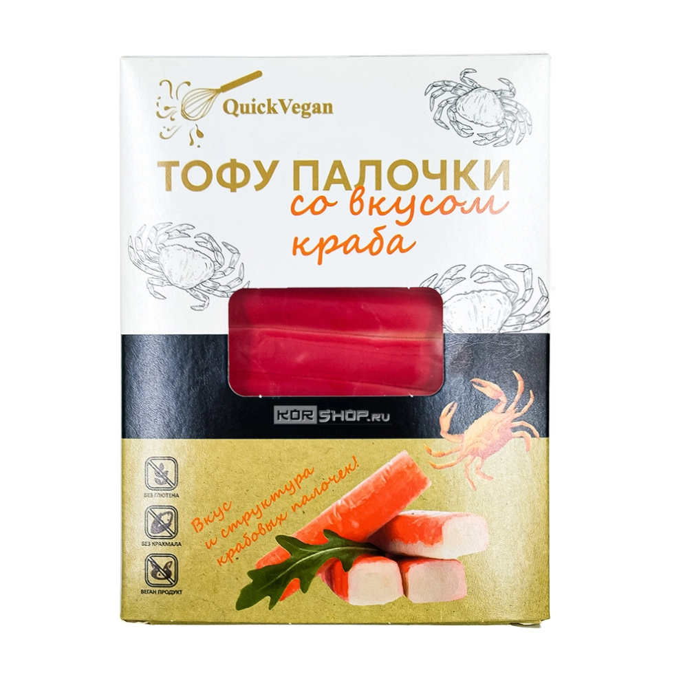 Тофу палочки со вкусом краба (веганские «крабовые» палочки) QuickVegan - продукт из соевых бобов, разновидность тофу, имитирующая крабовые палочки не только вкусом и текстурой, но и формой. Палочки тофу удобно использовать в салатах вместо крабовых палочек. Веганские «крабовые» палочки не содержат глютена и крахмала, их можно включать в рацион в пост. По вкусу отлично сочетаются с сочными и хрустящими свежими овощами, особенно огурцами, кукурузой и пекинской капустой. Для заправки салатов можно использовать майонезы на основе растительных масел.