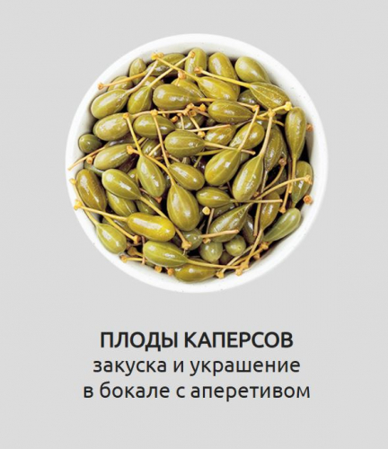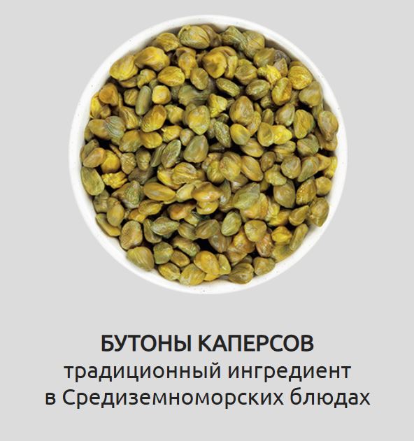 Каперсы бутоны -- маринованные бутоны каперсов незаменимы в классических соусах, для салатов, солянок, к супам-кальям, на пицце и с макаронами, замечательны с тушеной рыбой, бараниной, говядиной и птицей.