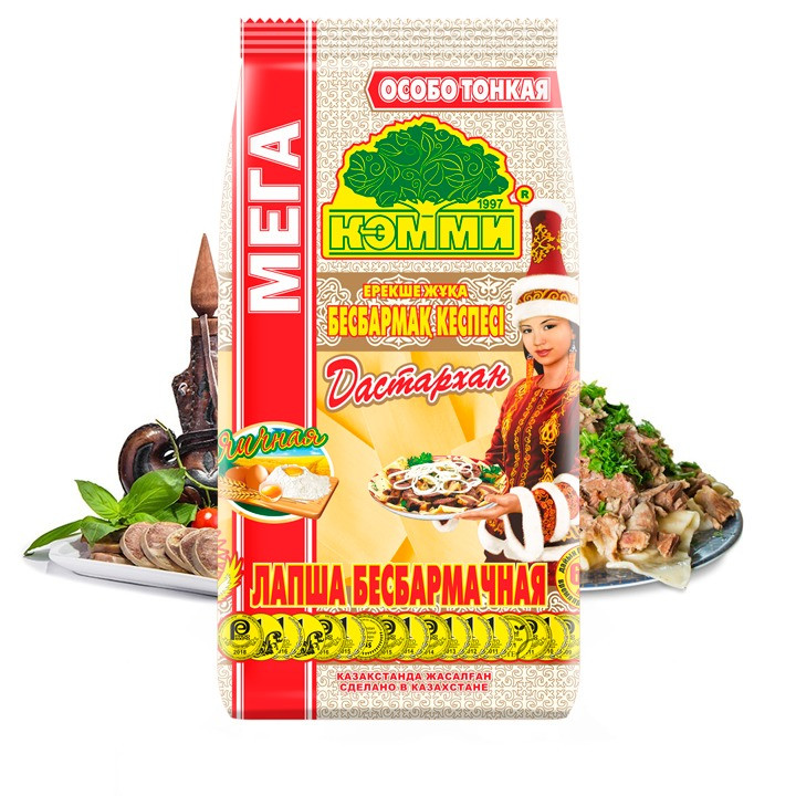 Лапша бесбармачная - полуфабрикат, используемый для приготовления традиционных блюд народов, проживающих в Казахстане и в странах Средней Азии. "Бесбармак" - одно из самых изысканных блюд казахской национальной кухни, пользующееся уважением за свои вкусовые качества и являющееся главным блюдом праздничного стола. Лапша бесбармачная "МЕГА Дастархан" не разваривается и по своим качествам не уступает лапше, приготовленной в домашних условиях.