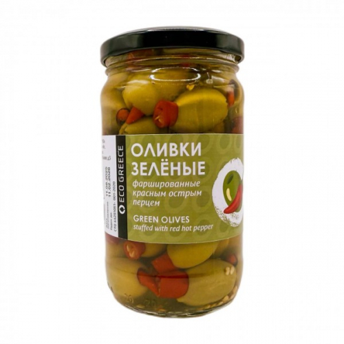 Оливки с Красным острым перцем в рассоле с маслом Eco Greece стекло 350 гр