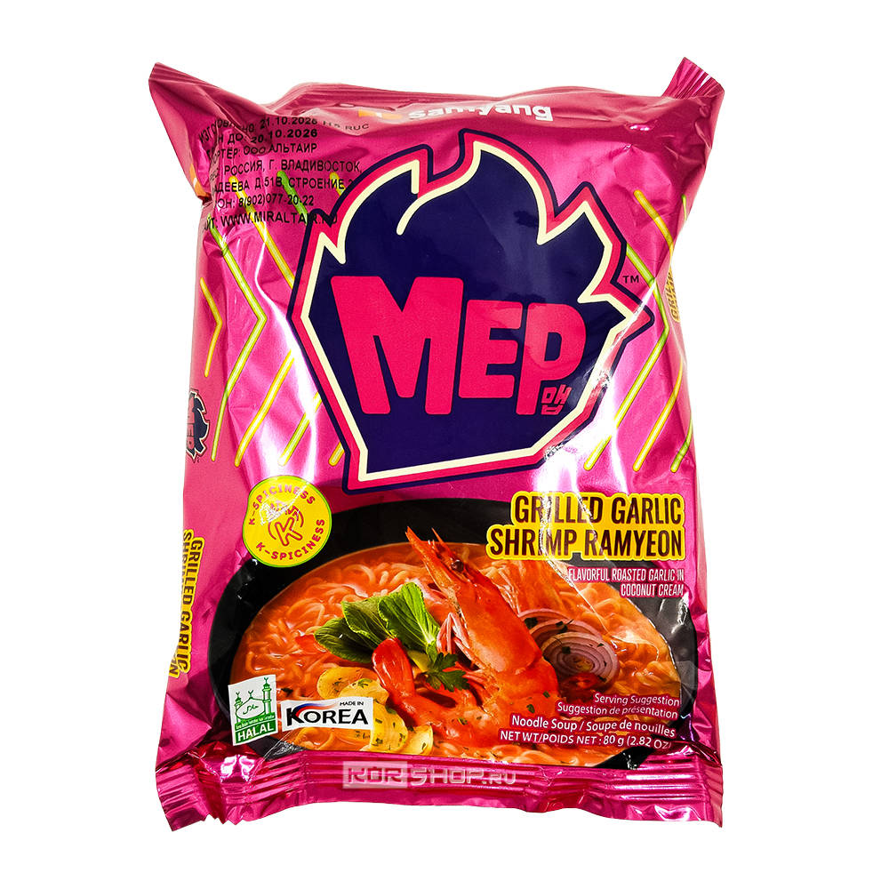 Лапша б/п со вкусом креветок и жареного на гриле чеснока Grilled Garlic Shrimp Ramyeon MEP Samyang отличается особым вкусом благодаря уникальной комбинации ингредиентов. Обжаренный на гриле чеснок привносит в бульон для лапши пикантные дымчатые оттенки и тонкую остроту. Экстракты морепродуктов (креветок и моллюсков) придают вкусу глубину и уникальные вкусовые оттенки даров моря. Кокосовое молоко смягчает букет вкусов, придавая бульону кремовую текстуру и усиливая богатую палитру ароматов, а сливки наделяют его особой нежностью. Благодаря черному перцу блюдо приобретает приятную согревающую теплоту. Лапшу нужно отварить в воде вместе с приправой 4 минуты – и восхитительный азиатский суп-лапша готов.