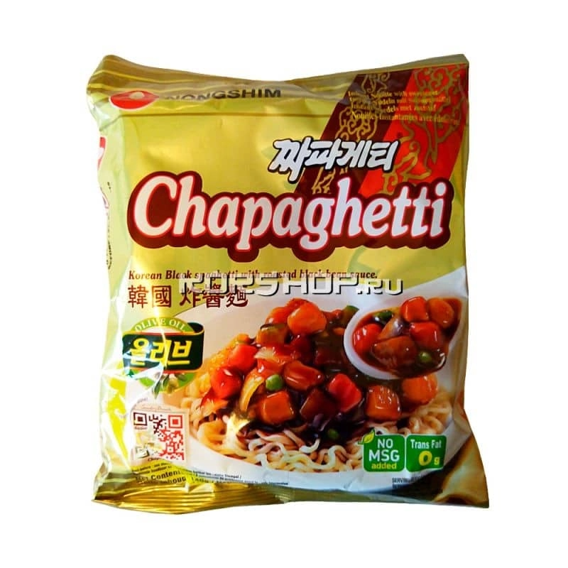 Лапша быстрого приготовления Чапагетти (Chapaghetti) (спагетти с мясным соусом и черными бобами) в пачке – это азиатская версия популярного блюда европейской кухни. Чапагетти напоминает известное корейское блюдо Чачжанмён - лапшу под мясным соусом с темными бобами. В отличие от оригинальных итальянских макарон, которые необходимо варить длительное время, этот продукт варится 3 минуты.