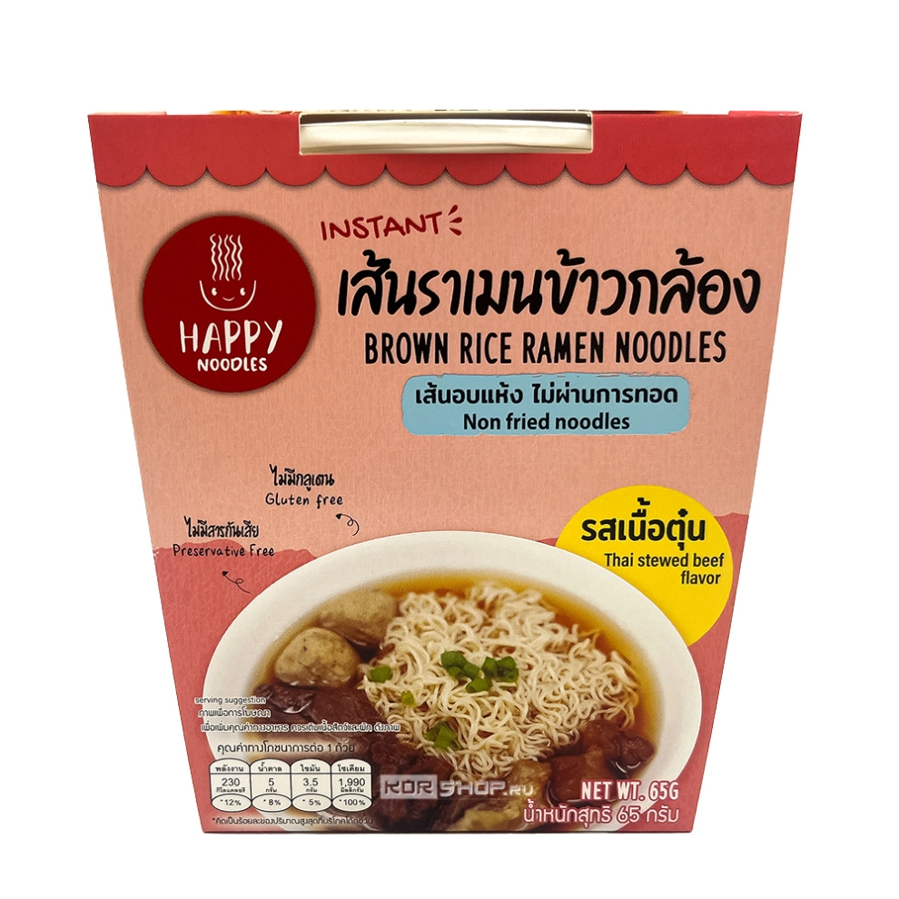 Лапша рамен из коричневого риса б/п «Говядина по-тайски» Happy Noodle понравится ценителям тайской кухни. Она приготовлена в соответствии с тайскими кулинарными традициями с применением аутентичных специй и приправ. Лапша заваривается в бульоне со вкусом говядины по-тайски. Аппетитный сытный горячий суп-лапша утолит голод и подарит большое удовольствие ценителям азиатской кухни. Блюдо готовится всего за несколько минут.