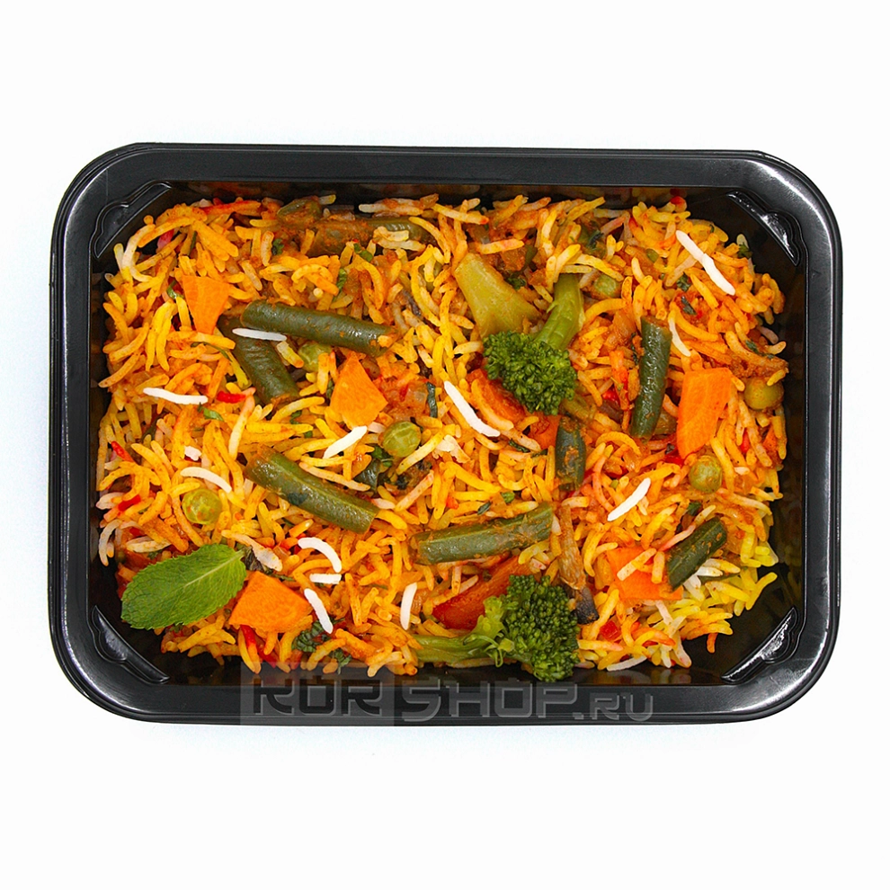 Рис бирьяни (бириани) с овощами и специями «Ведж Биряни» Ashokas – яркое индийское блюдо, приготовленное по традиционному рецепту. В основе — рассыпчатый ароматный рис, пропитанный букетом специй и насыщенным вкусом овощей. Помидоры, имбирь, морковь, брокколи, стручковая фасоль, зеленый горох и картофель создают гармоничное сочетание текстур и богатую вкусовую гамму. Натуральные пряности придают блюду выразительный восточный аромат и пикантную остринку. Достаточно разморозить и разогреть блюдо — и вы получите готовый обед или ужин, сытный и аппетитный.