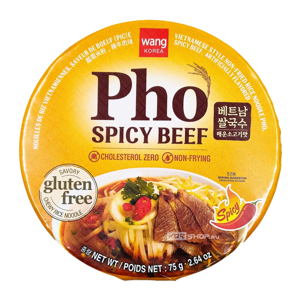 Рисовая лапша б/п со вкусом острой говядины Pho Spicy Beef Wang – это традиционное вьетнамское блюдо, представленное в формате быстрого приготовления. Суп фо готовится на насыщенном говяжьем бульоне с острыми приправами и дополняется плоской широкой рисовой лапшой, упругой и жевательной. Это классическое блюдо вьетнамской кухни любят во всем регионе Юго-Восточной Азии. Сытное, согревающее и очень аппетитное угощение будет готово всего за несколько минут.