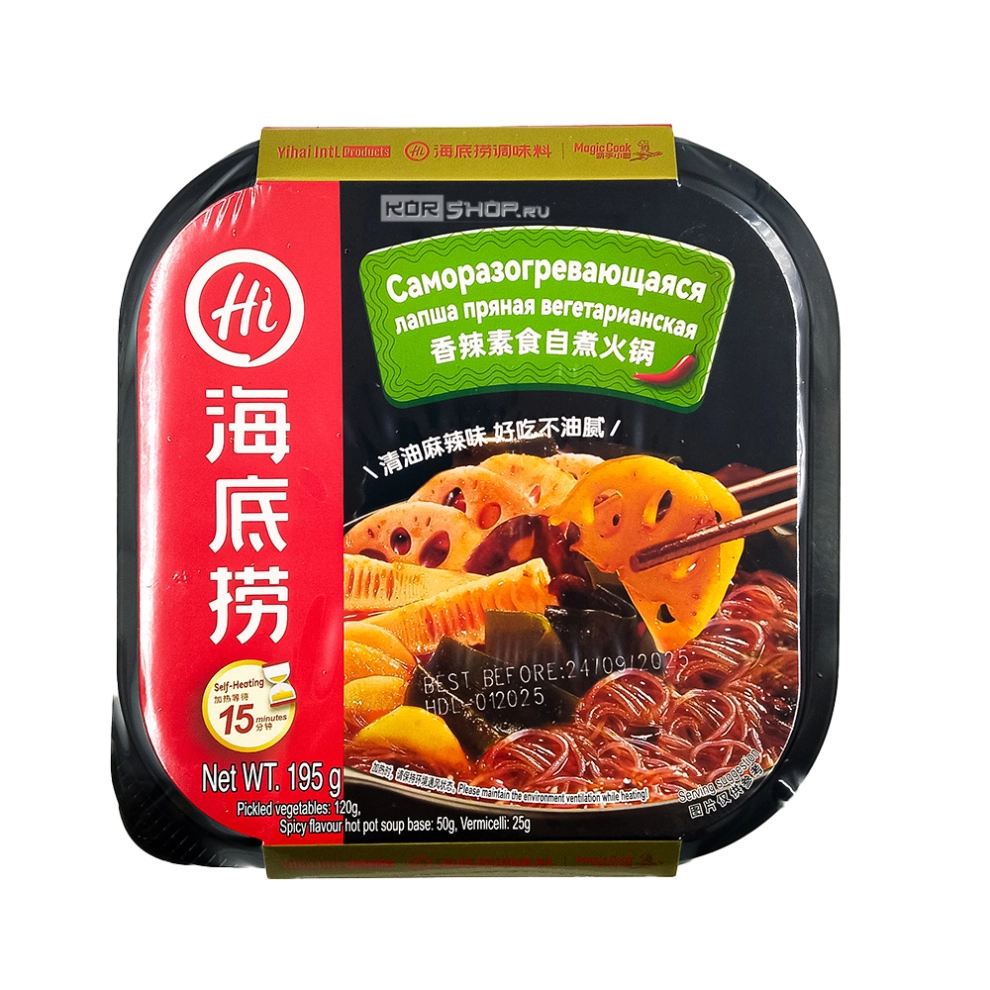 Саморазогревающаяся лапша пряная вегетарианская Haidilao станет отличным вариантом трапезы в условиях отсутствия возможности приготовить обед. Внутри контейнера находятся не только лапша и приправы, но и второй контейнер для водяной бани, а также нагревательный элемент, который активируется при контакте с самой обычной водой комнатной температуры. В процессе саморазогревания он вскипятит воду для водяной бани и будет поддерживать ее кипение некоторое время, в течение которого лапша сама дойдет до полной готовности. Блюдо приготовит себя само за 15 минут, а вам ничего не нужно для этого делать – только подождать. Саморазогревающаяся лапша – отличный вариант, когда нет ни микроволновки, ни чайника с горячей водой, чтобы заварить обычную лапшу б/п. Внутри упаковки есть всё необходимое, включая столовый прибор.