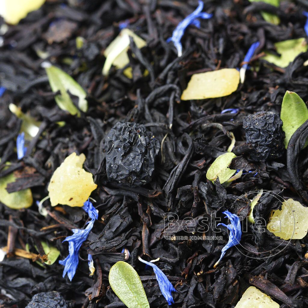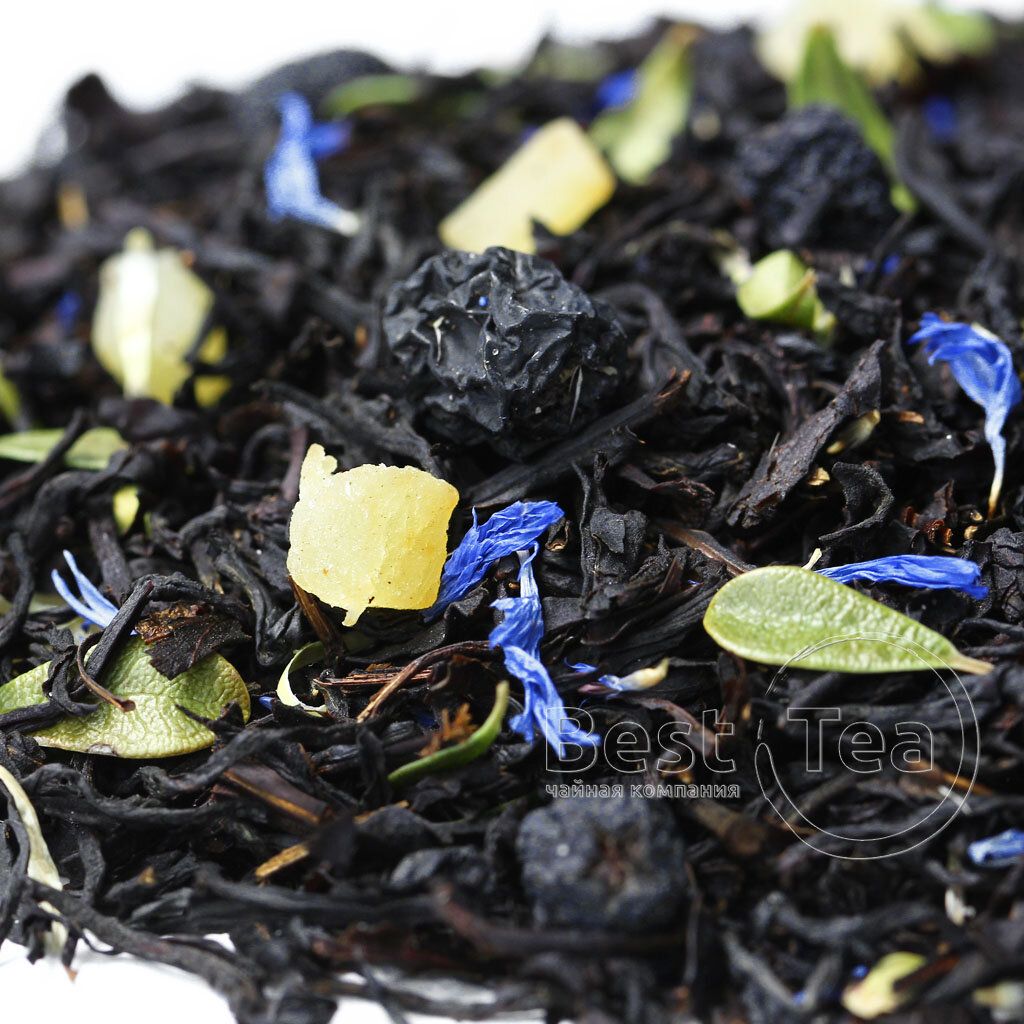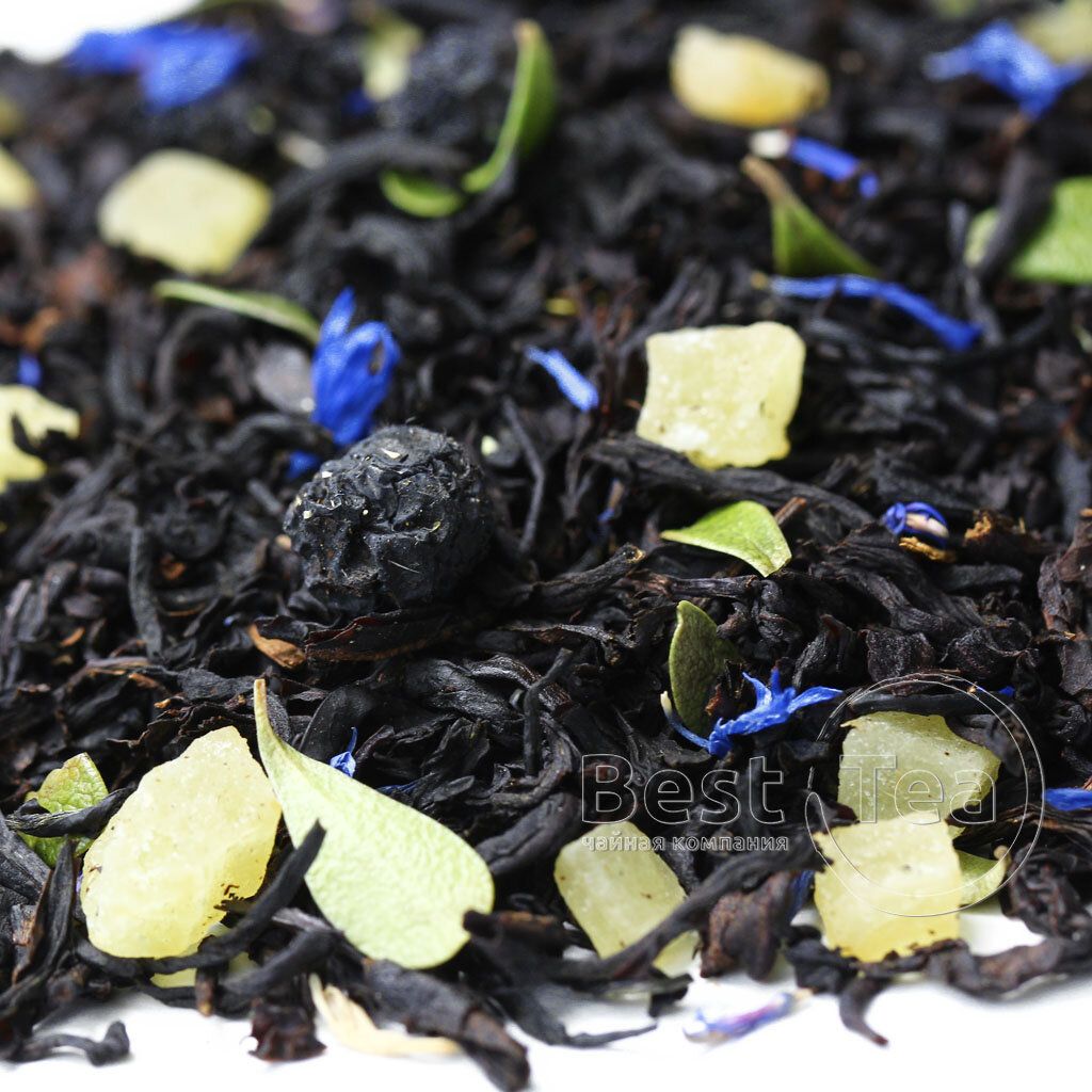 Состав Чай черный индийский, кусочки ананаса, ягоды черники, лепестки василька, листья брусники, аромат черники и сливок.