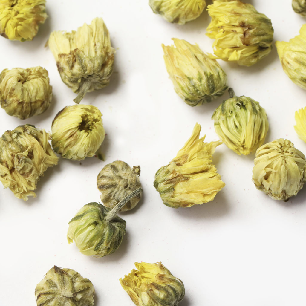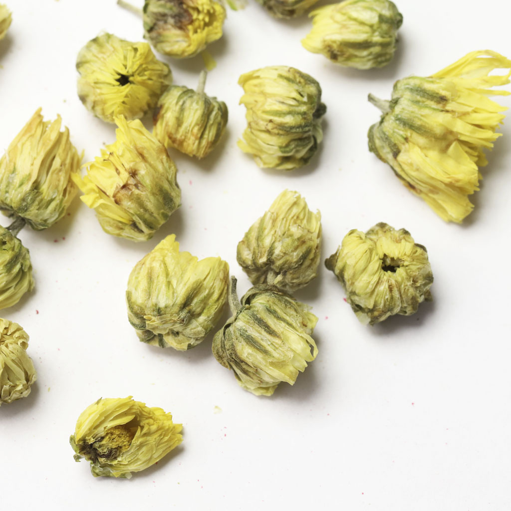 У китайской ромашки цветки собраны в соцветия, представляющие собой многоцветковые корзинки. В центре соцветия мелкие ярко-желтые трубчатые цветки, а по краю крупные язычковые цветки. Это растение образует множество желтых бутонов. Именно их используют в качестве добавки к чайным листьям для придания им аромата. При заваривании чая с китайской ромашкой напиток окрашивается в красивый янтарный цвет. Благодаря бутончикам ромашки вкус напитка становится более мягким, в нем появляются новые летние нотки. Цветки китайской ромашки богаты флавоноидами. Эти вещества способствуют укреплению стенок сосудов, уменьшая тем самым их ломкость. Кроме того они помогают активизировать ферментные системы организма. Седативное свойство цветков китайской ромашки обусловлено содержанием хризина. Это вещество способствует уменьшению беспокойства и беспричинного страха, помогает избавиться от кошмарных сновидений. Настой, приготовленный из одних цветов китайской ромашки, хорошо успокаивает нервную систему, уменьшает раздражительность. Лучше пить ромашковый настой на ночь, полученный успокаивающий эффект поможет справиться с бессонницей и обеспечит спокойный и здоровый сон.
