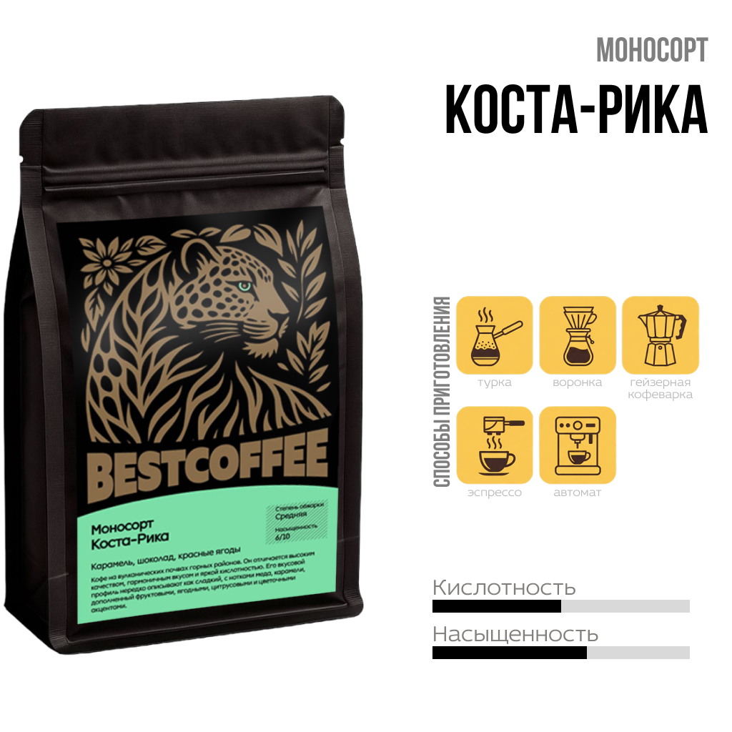 Кофе из Коста-Рики культивируется на вулканических почвах горных районов, что придает напитку уникальный характер. Он отличается высоким качеством, гармоничным вкусом и яркой кислотностью. Его вкусовой профиль нередко описывают как сладкий, с нотками меда, карамели или молочного шоколада, дополненный фруктовыми, ягодными, цитрусовыми и цветочными акцентами.
