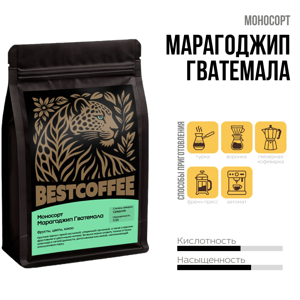 Кофе Гватемала Марагоджип раскрывает новые грани вкусовых и ароматических впечатлений. Его главная особенность — крупные зерна, которые полностью передают насыщенный вкус и аромат в каждой чашке. Напиток отличается яркой кислотностью, умеренной горчинкой, а также сладкими фруктовыми и цветочными нотами. Во вкусе можно уловить тонкие оттенки шоколада и легкой дымности, дополненные свежей кислинкой, напоминающей апельсиновую корку.