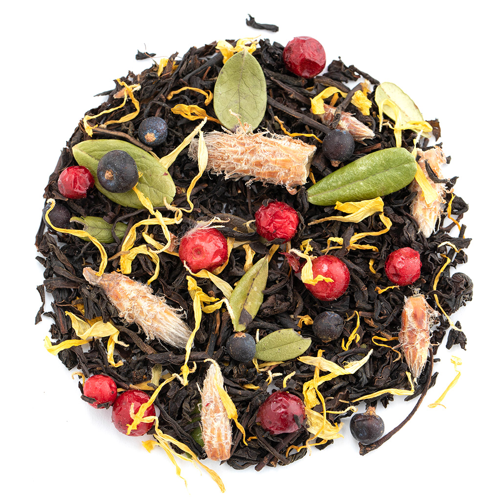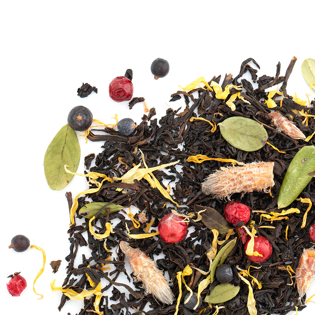 Богатый сбор, насыщенный яркими красками, укутан ароматом хвойных смол с лакричной ноткой, наполнен духом свободы и дальних странствий. Готовый настой дышит насыщенным ароматом, в котором слышны хвойные, брусничные и цветочные нотки . Бархатистая терпкость черного чая туго переплелась с ягодными и смолистыми оттенками. Это чай с уникальным характером, бунтарский и своевольный, ни на что не похожий! Состав Чай черный индийский Ассам, почки сосны, плоды можжевельника, ягоды брусники, листья брусники, лепестки календулы, ароматизатор "Садовые травы".