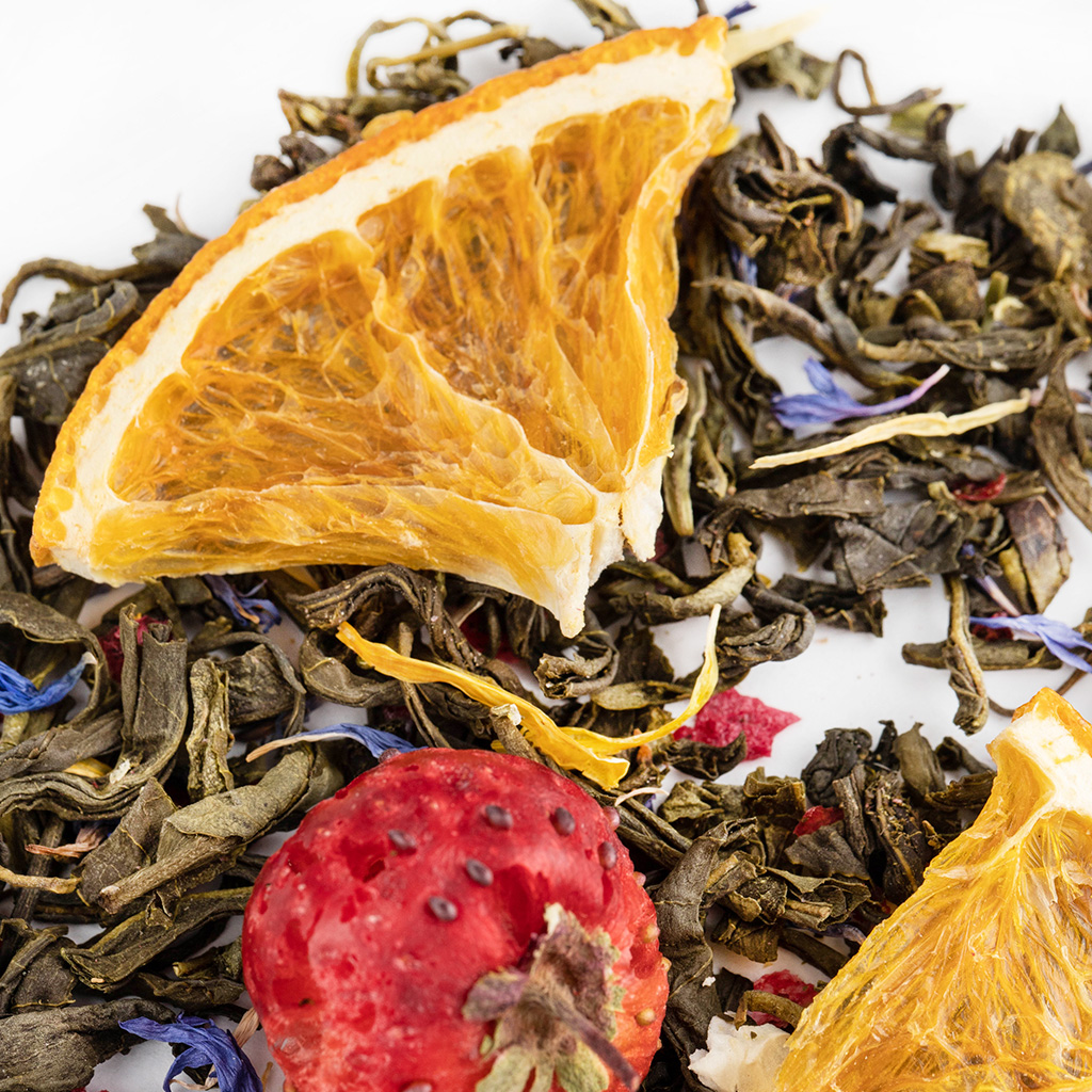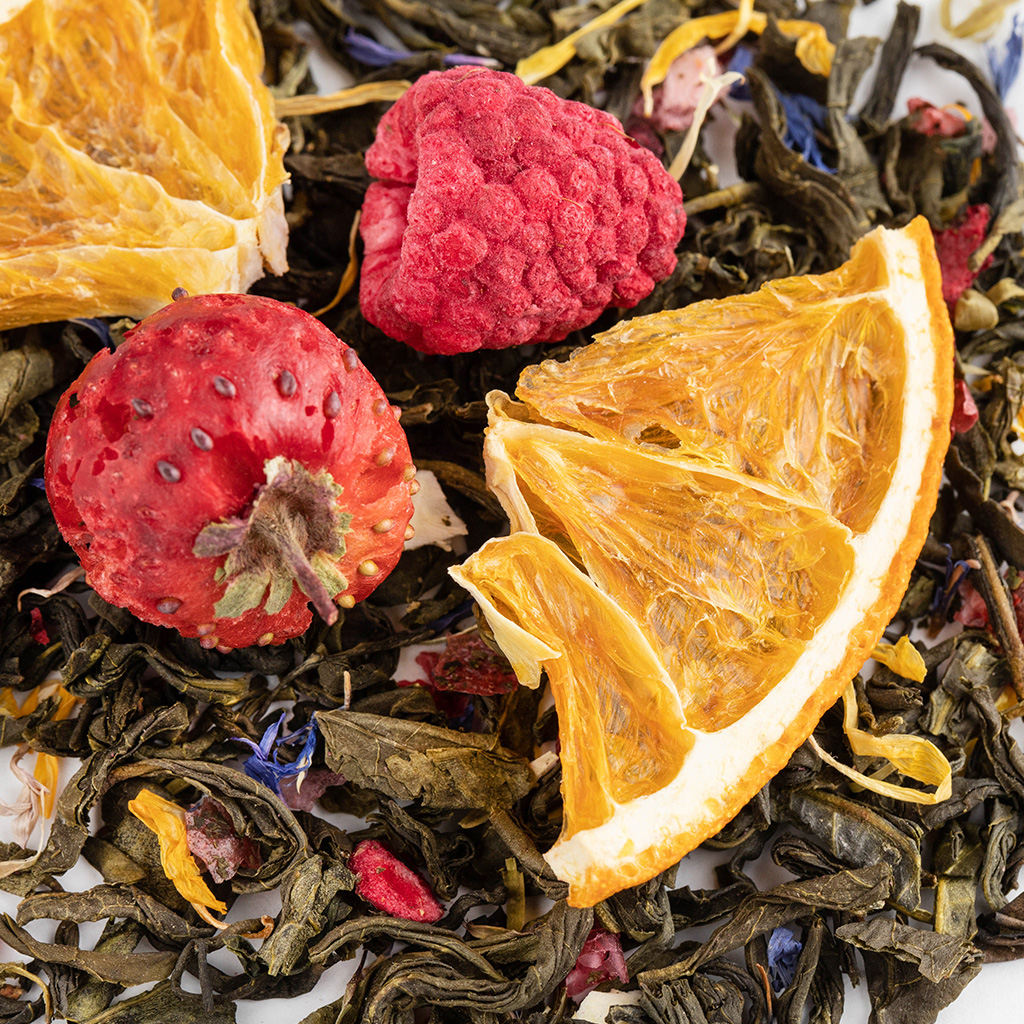 Чай зеленый китайский среднелистовой, целые ягоды малины, целые ягоды клубники, кусочки апельсина с цедрой, дольки апельсина, кусочки клюквы, лепестки василька синего, лепестки календулы, аромат фруктового сада.