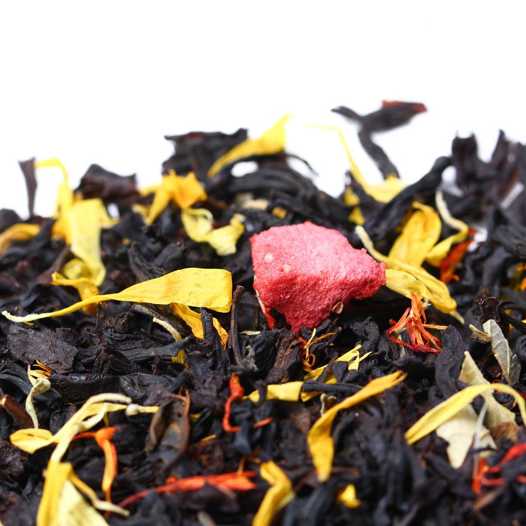 Чай черный цейлонский, кусочки клубники, лепестки календулы, лепестки сафлора, листья смородины, аромат садовой земляники