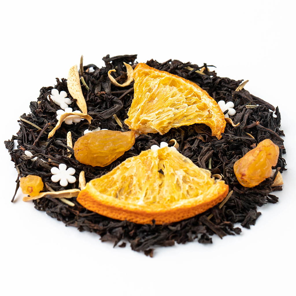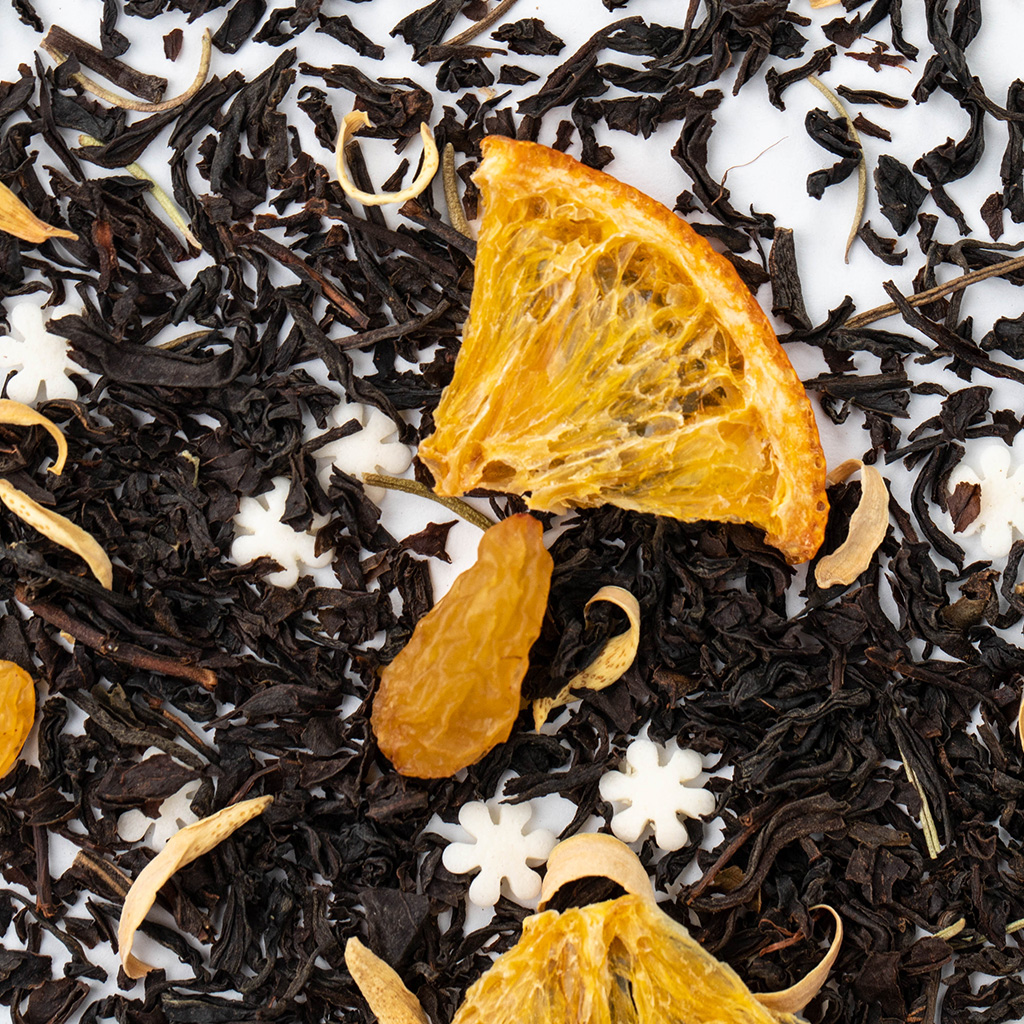 Состав: Чай черный индийский, изюм, посыпка кондитерская декоративная «Снежинки», апельсин сегмент, апельсин цветы, розмарин, аромат "Рождественская выпечка".