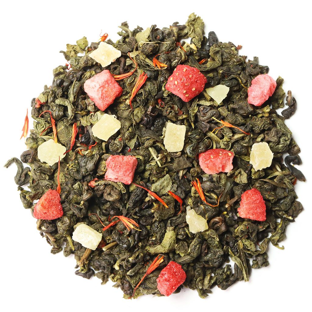 Нежный вкус кусочков клубники дополнен чувственным прикосновением зеленого чая в сочетании с лепестками сафлора. Аппетитный аромат земляники со сливками обволакивает собой этот коктейль. Яркие красные огоньки на фоне темно-зеленого чая выгодно дополнены глубоким тоном зелени листьев. Главный вкусовой элемент принадлежит клубничному коктейлю, легкую дразнящую горчинку которому сорт зелёного чая, а лепестки сафлора помогает композиции раскрыться ярче. Аромат детства и воспоминания о каникулах у бабушки в деревне - главные преимущества этого чая. Красивый зелено-янтарный оттенок порадует эстетов. Вы можете купить высококачественный Зеленый чай Земляника со сливками кат. B в интернет-магазине чайной компании BestTea оптом или в розницу, на выгодных условиях, с доставкой по России и СНГ. Количество чая: 2 чайные ложки Объем и температура воды: 450 мл., 85-90 С Время заваривания: 5 минут Состав Чай зеленый китайский, кусочки ананаса, кусочки клубники, лепестки сафлора, аромат клубники и сливок.