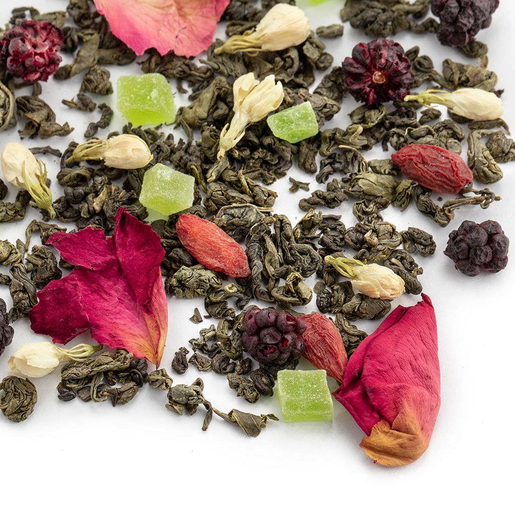 Состав Чай зеленый ганпаудер, ягоды ежевики, кусочки ананаса, ягоды годжи, лепестки розы, листья ежевики, цветы жасмина, аромат тропических фруктов.