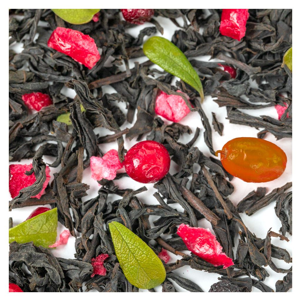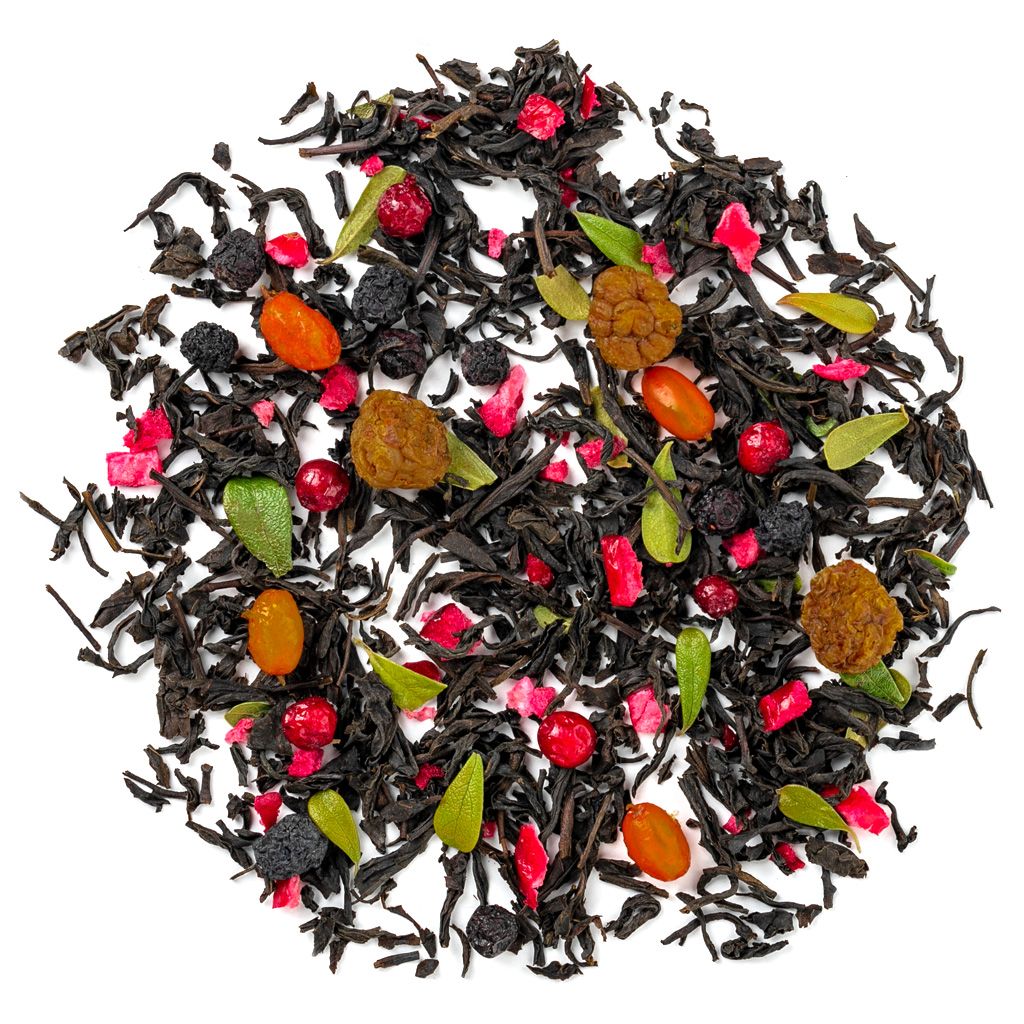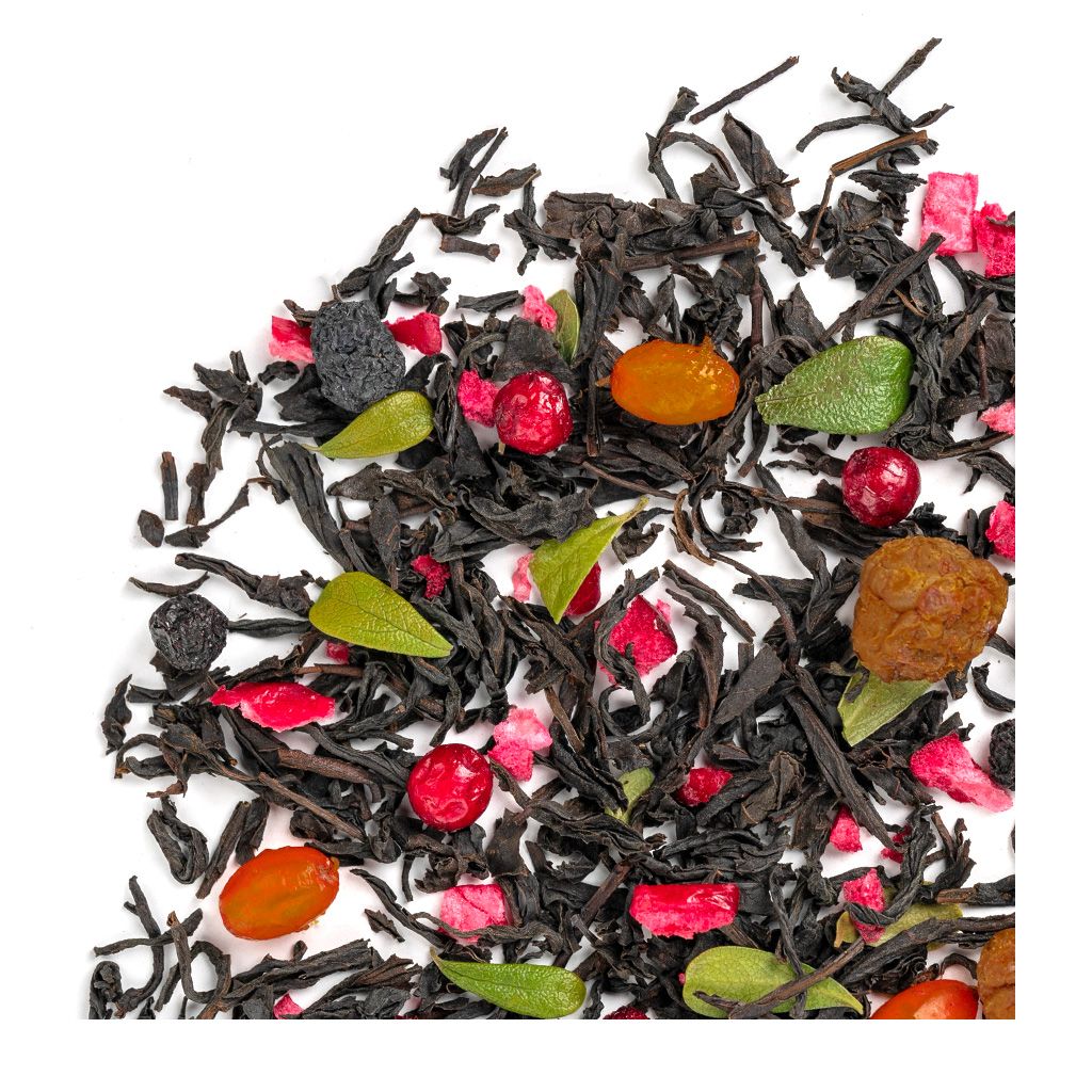 Состав Чай черный индийский, плоды аронии, ягоды морошки, листья брусники, ягоды брусники, ягоды облепихи, кусочки клюквы, ягоды черники, ароматизатор "Лесные ягоды".