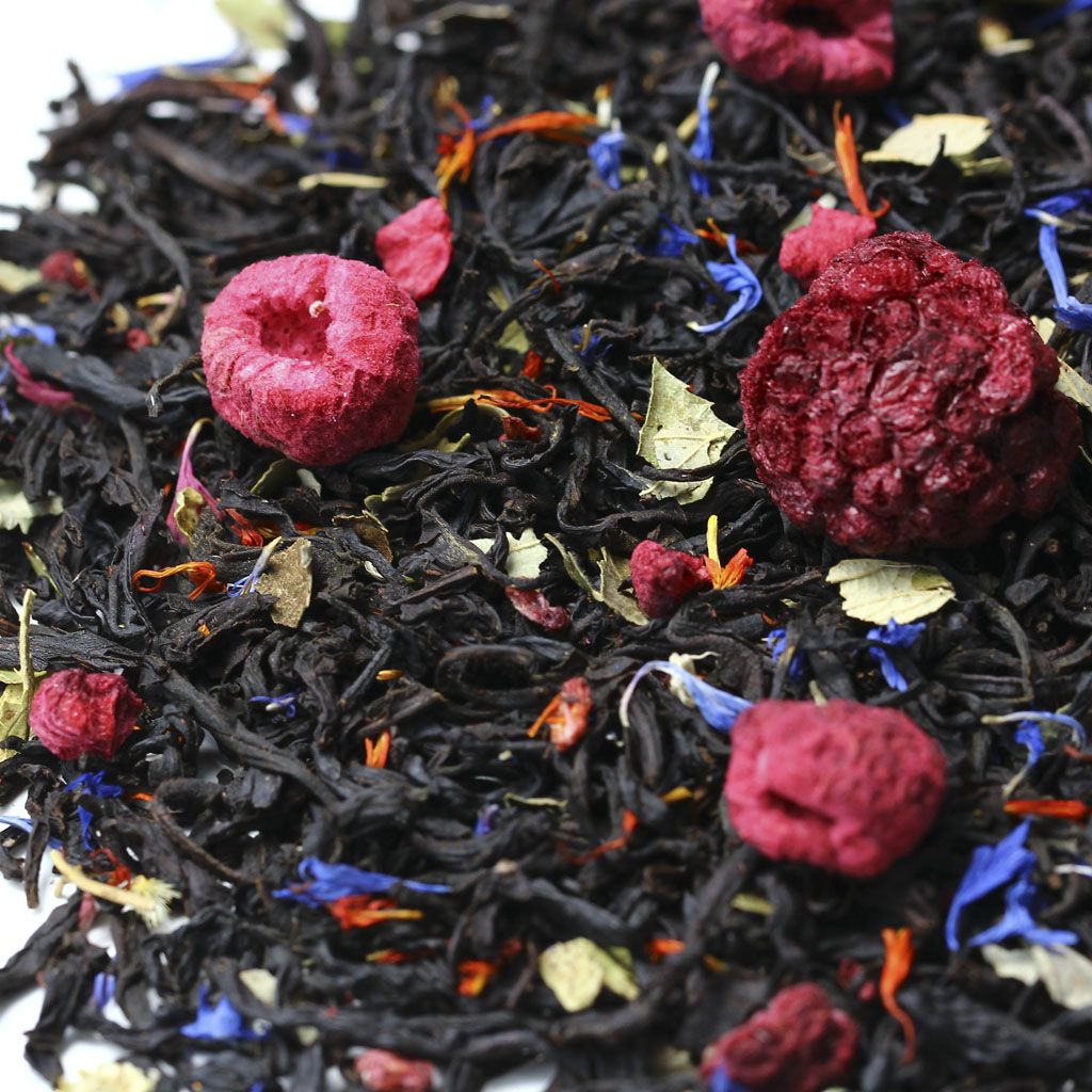 Чай черный индийский, целые ягоды ежевики, целые ягоды малины, кусочки малины, листья ежевики, лепестки василька, лепестки сафлора, аромат ежевики и малины