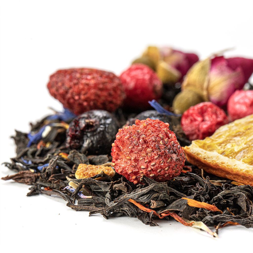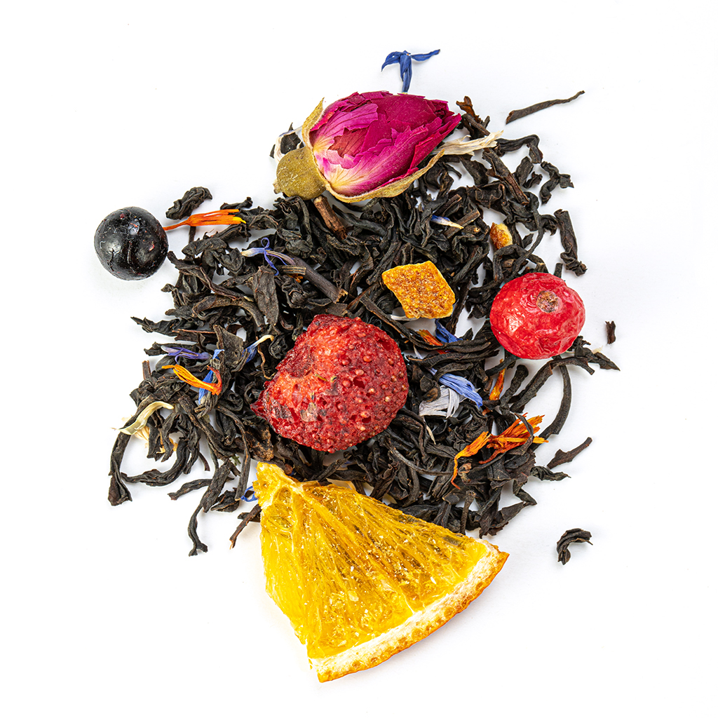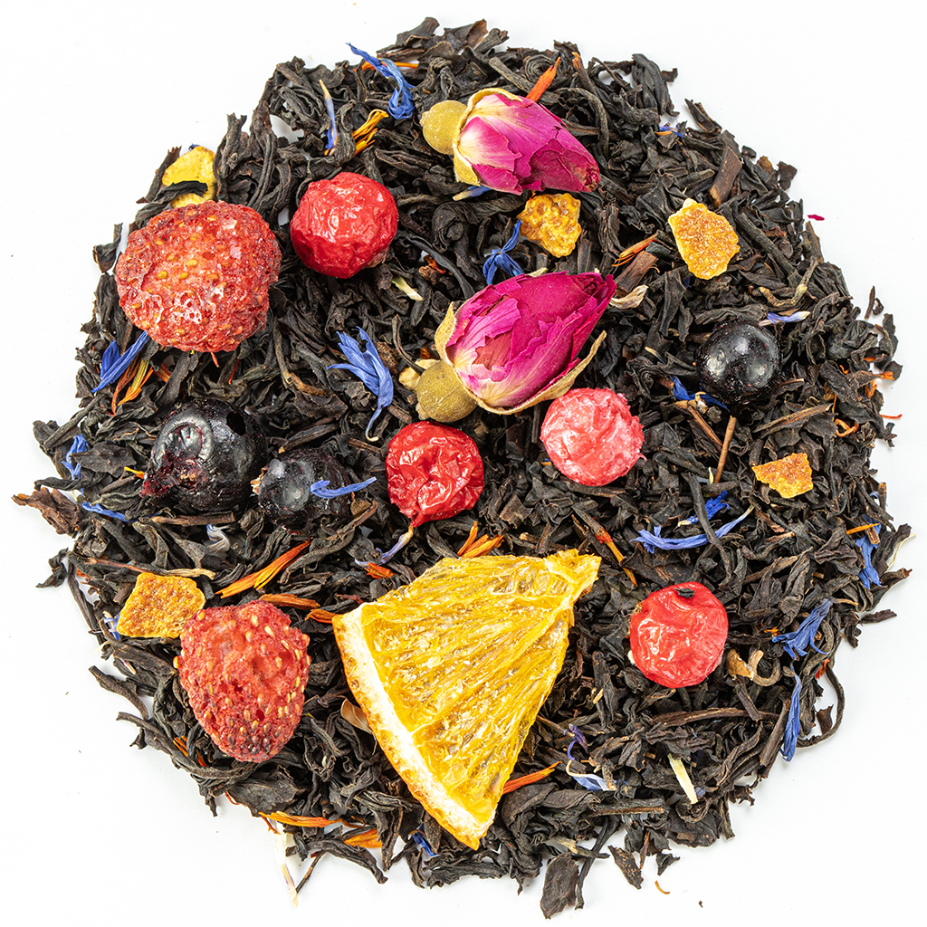 Состав: чай черный индийский, сегменты апельсина, ягоды черной смородины, ягоды земляники, цедра апельсина, бутоны розы, ягоды красной смородины, лепестки василька, лепестки сафлора, аромат садовых ягод