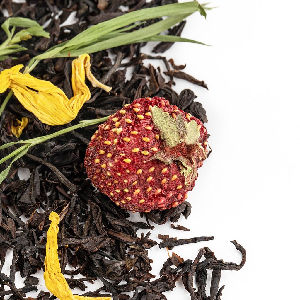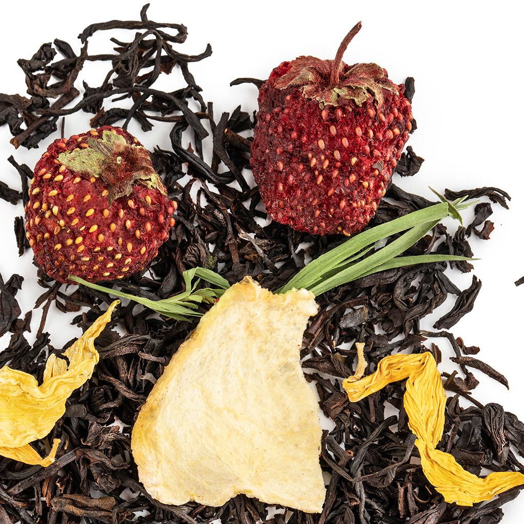 Состав: чай черный индийский, ягоды клубники, слайсы дыни, листья бамбука, лепестки подсолнуха, аромат "Клубника-Дыня"