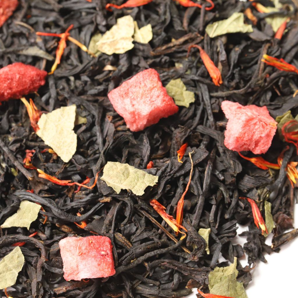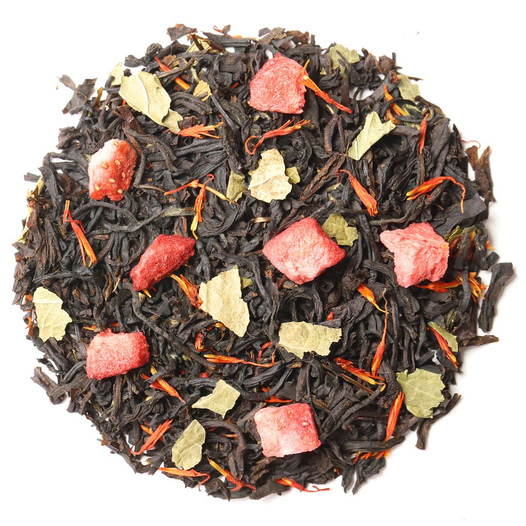 Чай черный цейлонский, кусочки клубники, лепестки сафлора, листья смородины, аромат клубники и сливок