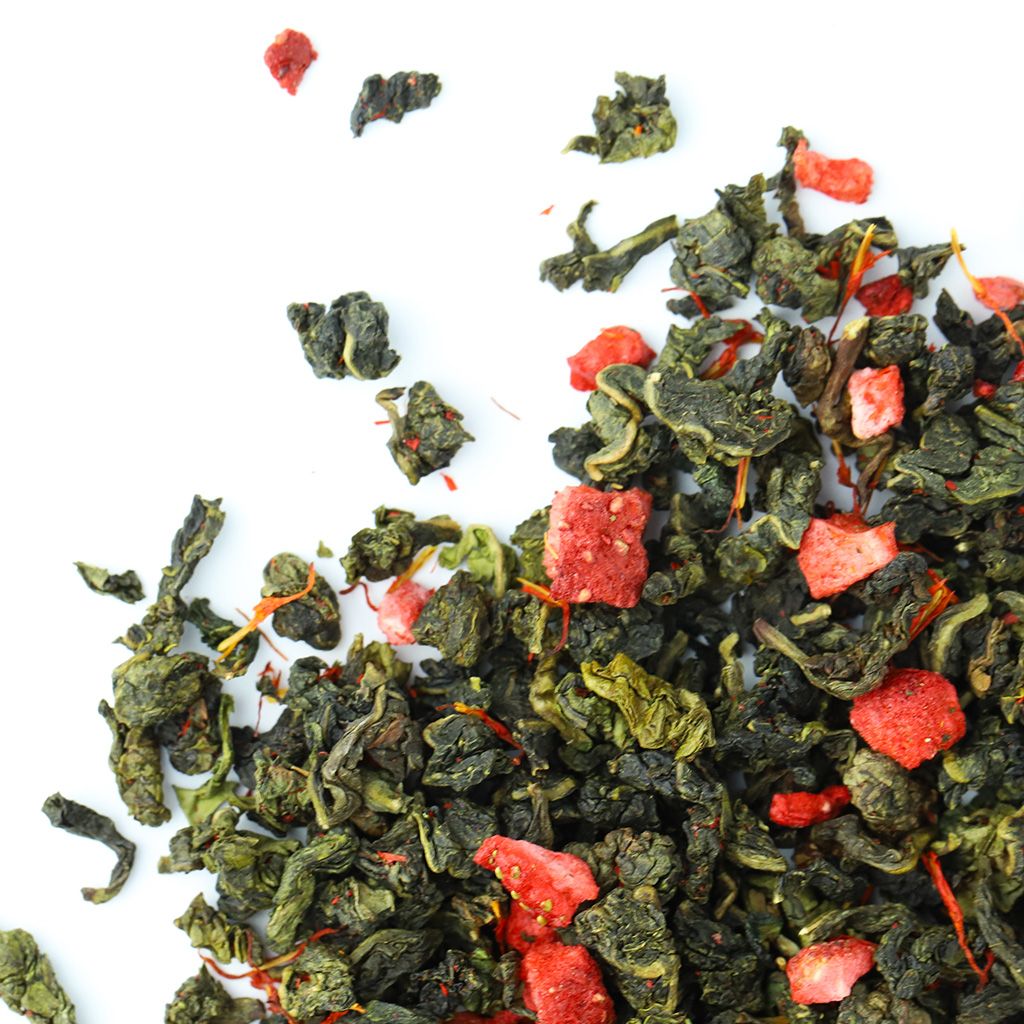 Популярный полу ферментированный чай, относящийся к категории Улунов в сочетании с кусочками клубники. Сухая смесь представляет собой игру контрастов красных кусочков и зеленых чайных узелков. Аромат клубники и сливок обволакивает мягкий деликатный вкус улуна с ягодной сладостью клубники/ Готовый настой приобретает золотистый бледно-желтый цвет. Состав: китайский чай улун, кусочки клубники, лепестки сафлора, аромат клубники и сливок