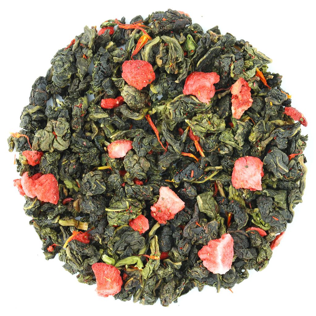 Популярный полу ферментированный чай, относящийся к категории Улунов в сочетании с кусочками клубники. Сухая смесь представляет собой игру контрастов красных кусочков и зеленых чайных узелков. Аромат клубники и сливок обволакивает мягкий деликатный вкус улуна с ягодной сладостью клубники/ Готовый настой приобретает золотистый бледно-желтый цвет. Состав: китайский чай улун, кусочки клубники, лепестки сафлора, аромат клубники и сливок
