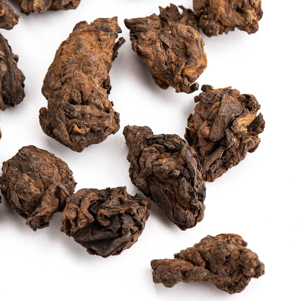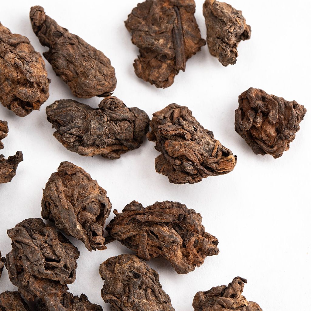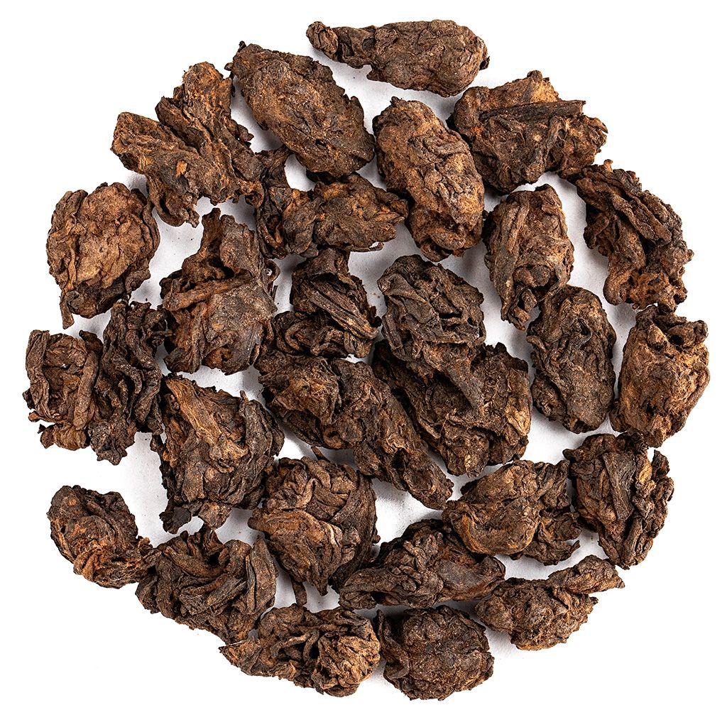 Дикий комковой пуэр-шу кат. В несомненно является одним из самых элитных и дорогих чаев в мире. Это в первую очередь обусловлено его долгим процессом ферментации, что позволяет раскрыть все грани этого насыщенного настоя. Не стоит забывать, что помимо своих непревзойдённых вкусовых качеств напиток имеет в своем составе и полезные вещества. Внешний вид этого чайного продукта не слишком привлекательный, однако это никоим образом не сказывается на его вкусовых свойствах. Это спрессованный, комковой чай с ярким, незабываемым ароматом. Чай изготавливается из листьев диких чайных деревьев, произрастающих в китайской провинции Юннань. Что же касается аромата этого чая, то он несомненно заслуживает отдельного внимания. Аромат дикого комкового шу пуэра сочетает в себе ягодно-фруктовые и древесно-ореховые нотки. Несомненно, чувствуется и шоколадный оттенок, что придает напитку обволакивающий, согревающий эффект без излишней терпкости. После приготовления напиток приобретает цвет горячего шоколада со слегка уловимым рубиновым оттенком.