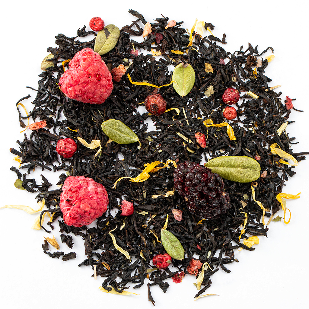 Чай черный индийский Ассам, ягоды малины, ягоды ежевики, ягоды брусники, кусочки клюквы, листья брусники, листья ежевики, лепестки календулы, аромат лесных ягод. Количество чая: 2 чайные ложки Объем и температура воды: 450 мл., 90-98 С Время заваривания: 2-5 минут
