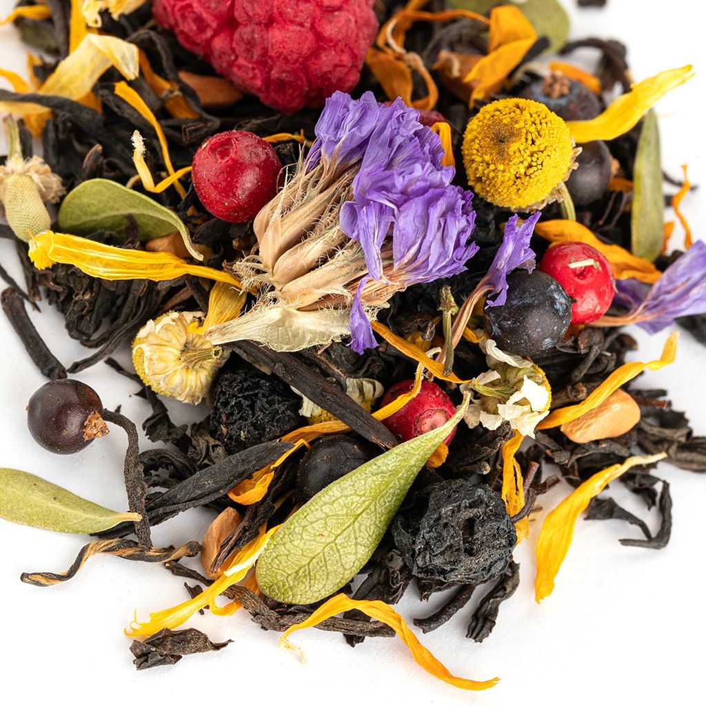 Состав Чай черный индийский, плоды аронии, чабрец, сушеный шиповник, цветы ромашки, ягоды можжевельника, малина, брусника , цветы незабудки, листья брусники, лепестки календулы, аромат вишни и клубники