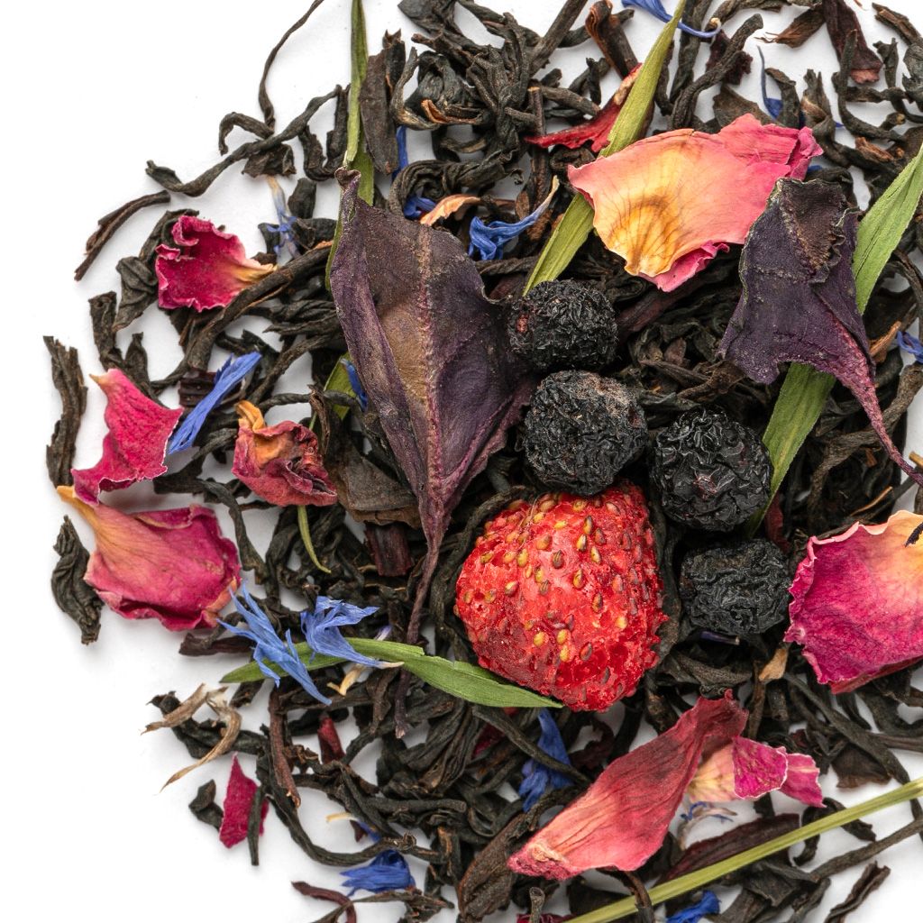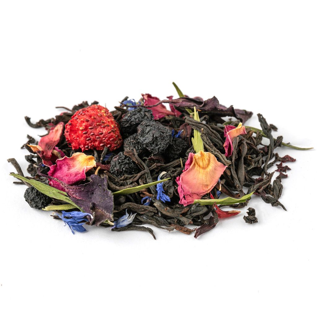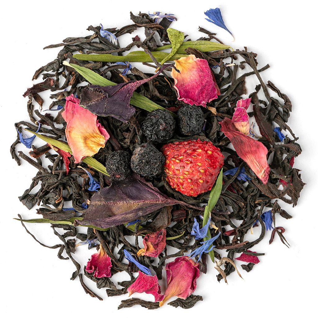 Состав Чай черный индийский, ягоды клубники, плоды аронии, каркадэ, листья базилика, лепестки розы, листья бамбука, лепестки василька
