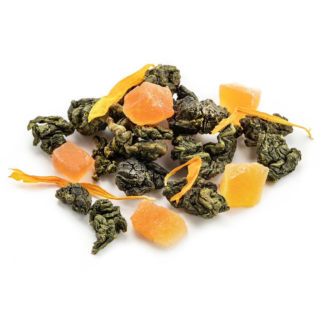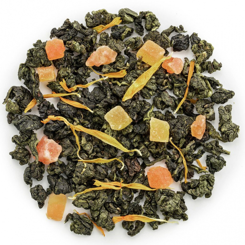 Тонкое созвучие китайского улуна, кусочков папайи и лепестков календулы. Солнечная цветовая композиция составлена из желтых и оранжевых оттенков фруктовых кусочков и цветочных лепестков на фоне зелени чайного листа. Тропическая сладость папайи и экзотический аромат манго по новому раскрывают вкус китайского чая. При заваривании сухая россыпь превращается в ароматный прозрачно-янтарный настой.