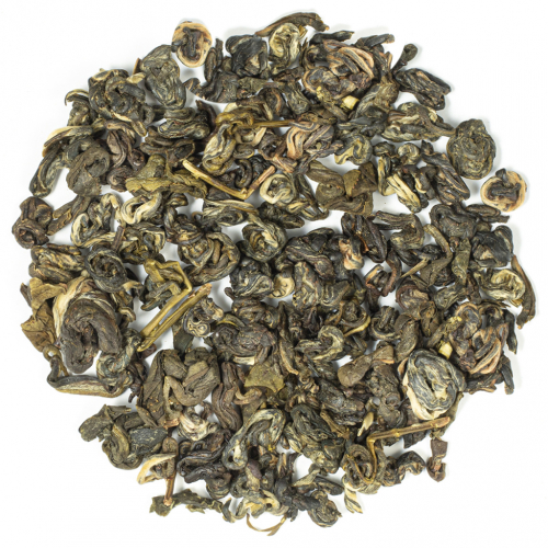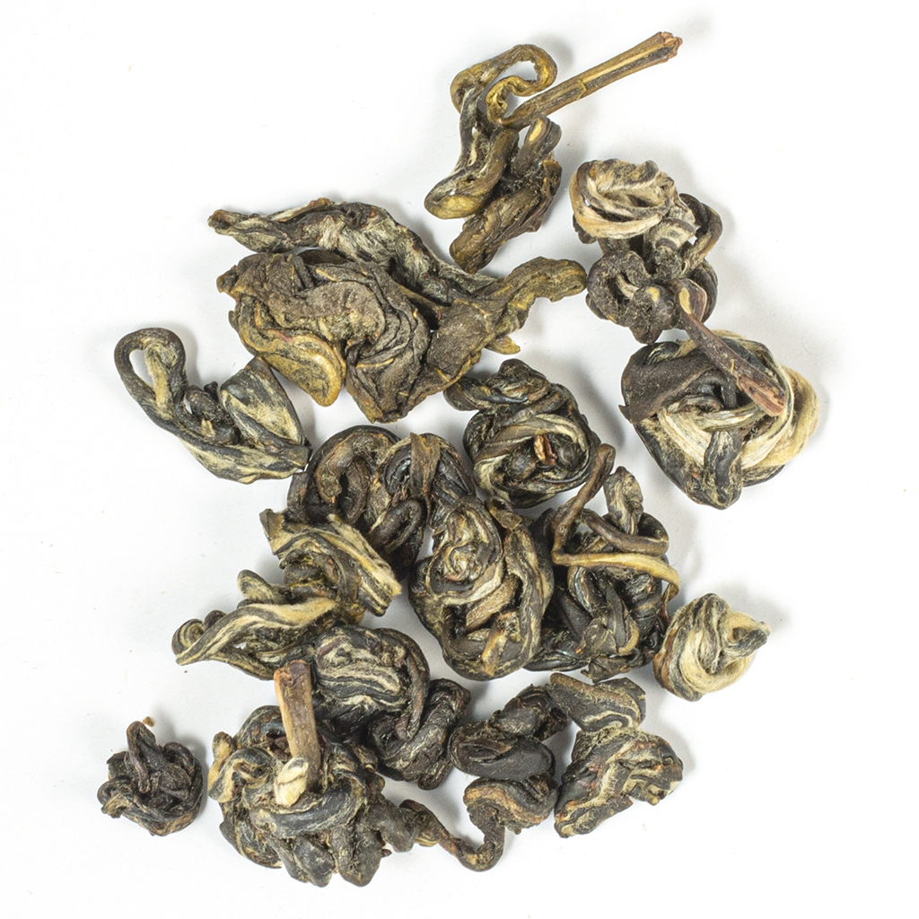 Чай носит название Жасминовая улитка. Для производства используют чайные флеши, нежнейшие молодые почки. Их собирают вручную. Готовое сырье на солнышке подвяливают, а потом скручивают, придавая ему форму улиток. Именно это и дало чаю такое название. После ферментации листочки смешивают с жасмином, чтобы в процессе хранения они впитывали в себя цветочный аромат. Цветы, которые используют для приготовления чая, собирают в провинции Фуцзянь. Тонкий запах напитка сочетается со тонким вкусом. В нем чувствуются свежие травянистые нотки. Жасмин придает чаю удивительный аромат, но при этом его вкус не заглушается, а только подчеркивается. Жасминовая улитка, завариваясь в чашке, становится легкого желтоватого цвета, имеет оттенок золотистого весеннего меда.