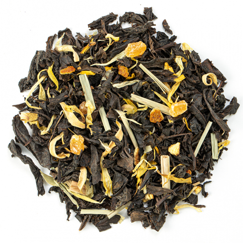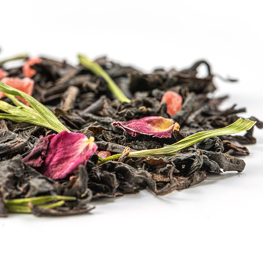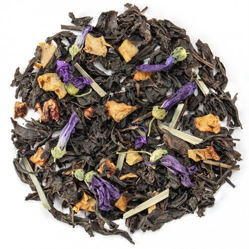 Состав: чай черный, цукаты ананаса, листья бамбука, лепестки розы, аромат ягодного тарта
