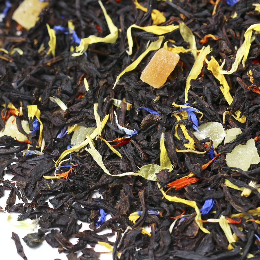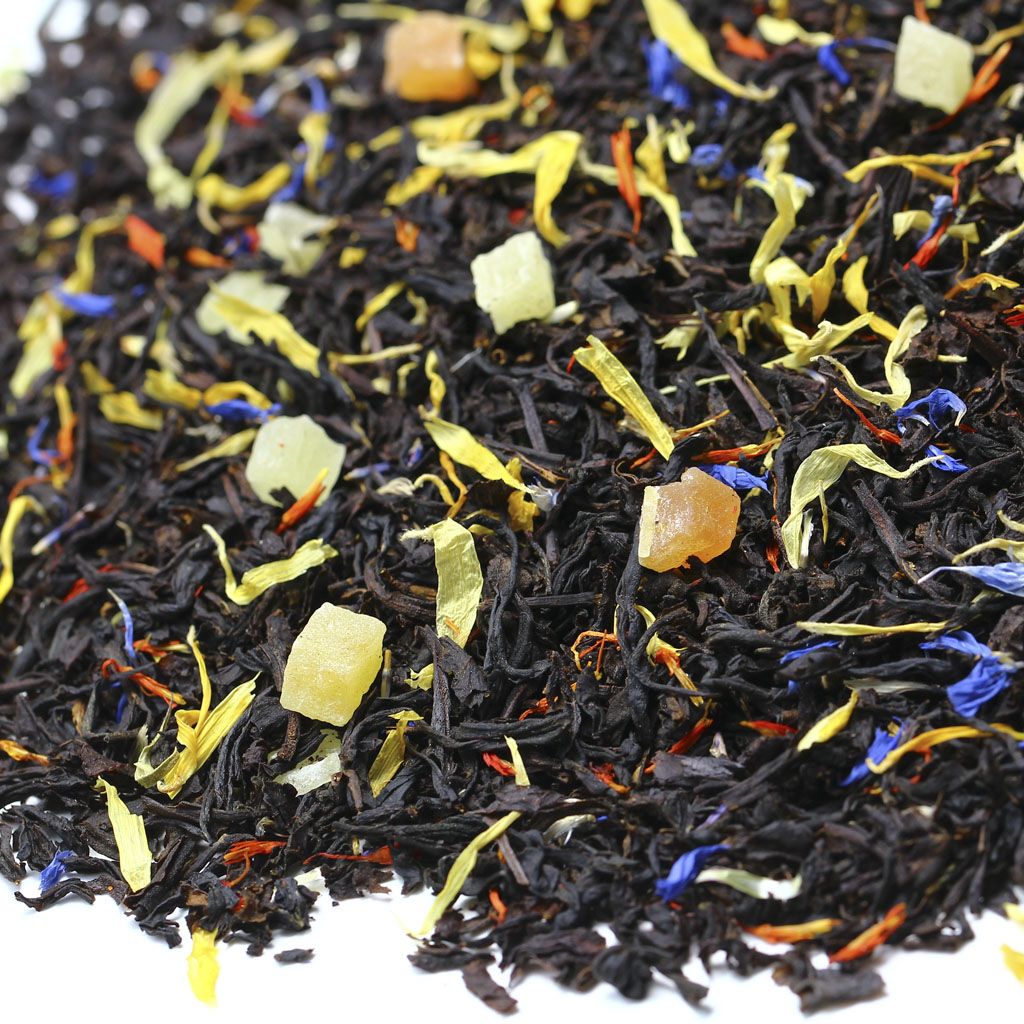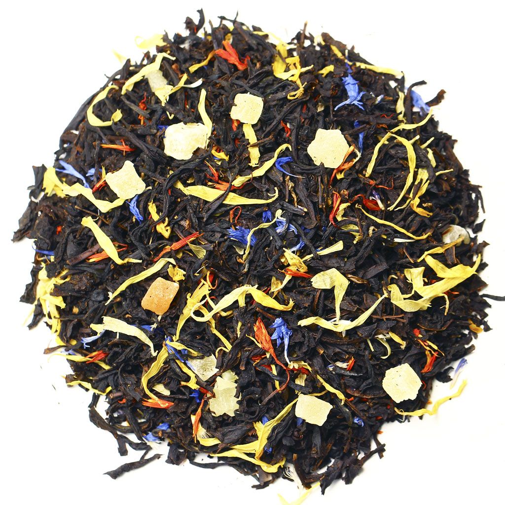 Россыпь черного чая, выращенного на Цейлоне, "острове чая", дополнена кусочками ананаса, лепестками календулы, синего и красного василька. Роскошная и неповторимая, как причудливый наряд из многочисленных юбок царицы, смесь сухих листьев завораживает разнообразием желтых, розовых и синих оттенков. Готовый напиток обладает роскошным бархатным вкусом черного чая. Запоминающийся освежающий оттенок создается благодаря сладости тропических фруктов и неповторимого аромата манго, наполняющего собой каждый глоток. Количество чая: 2 чайные ложки Объем и температура воды: 450 мл., 90-95 С Время заваривания: 5 минут Состав Чай черный цейлонский, кусочки ананаса, кусочки папайи, лепестки календулы, лепестки василька, лепестки красного василька, аромат манго.