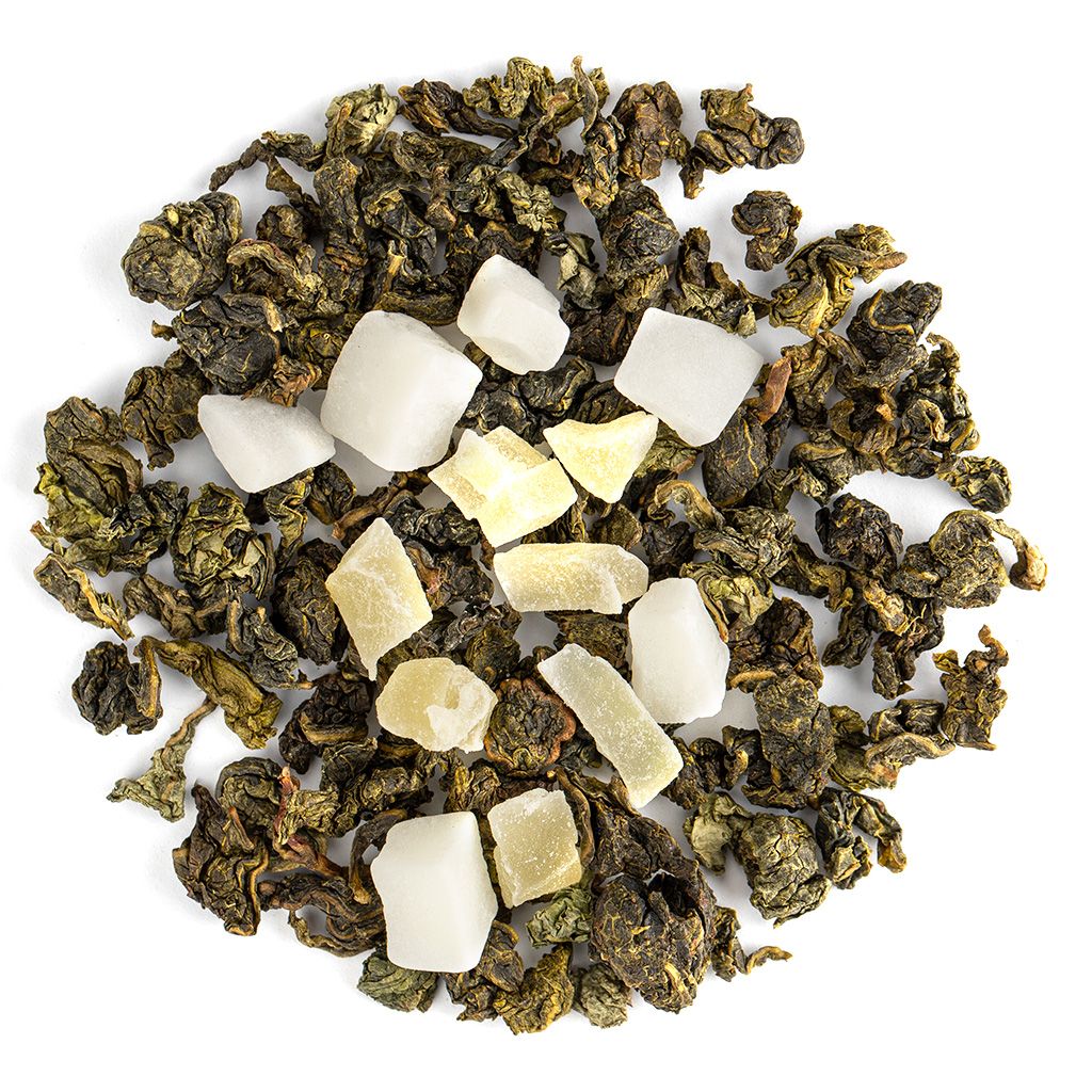 Состав: Чай улун китайский, ананас кусочки, кокос кусочки, ароматизатор "Ананас-Кокос".