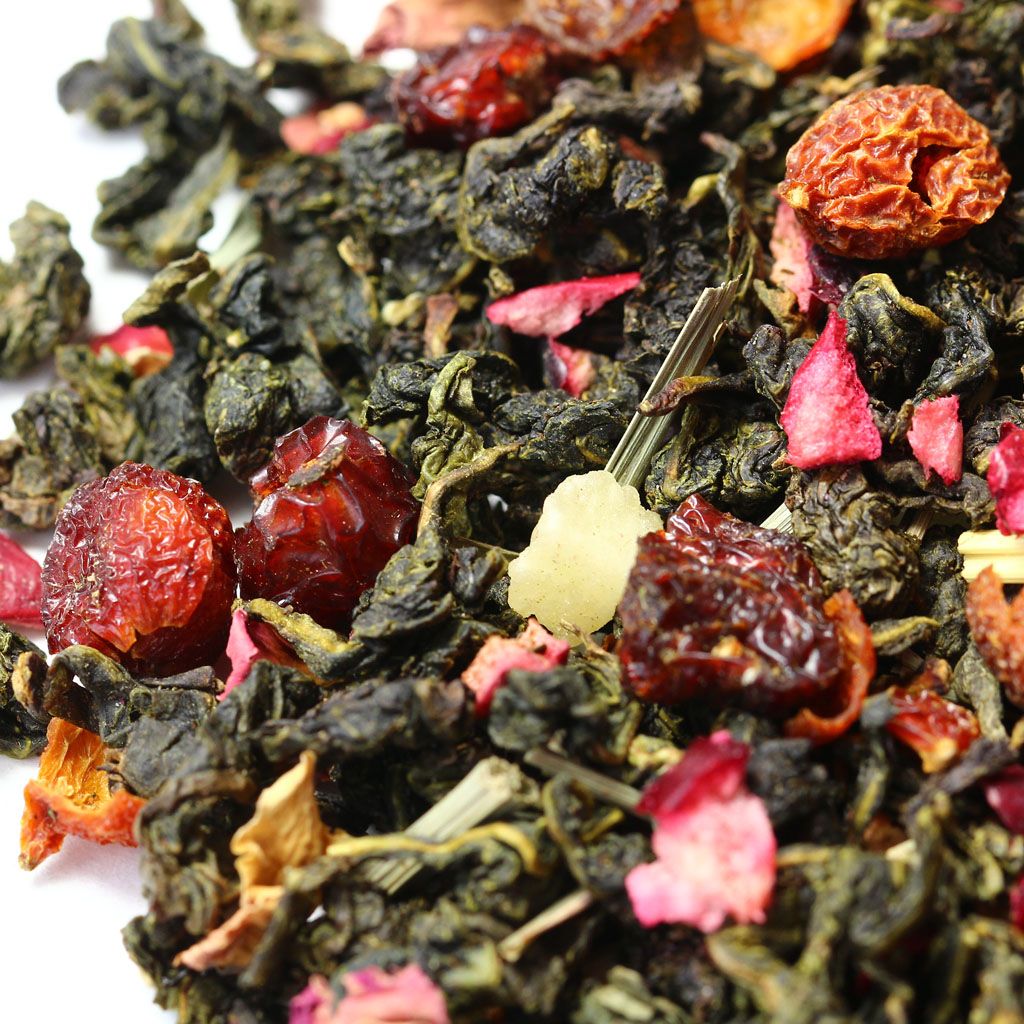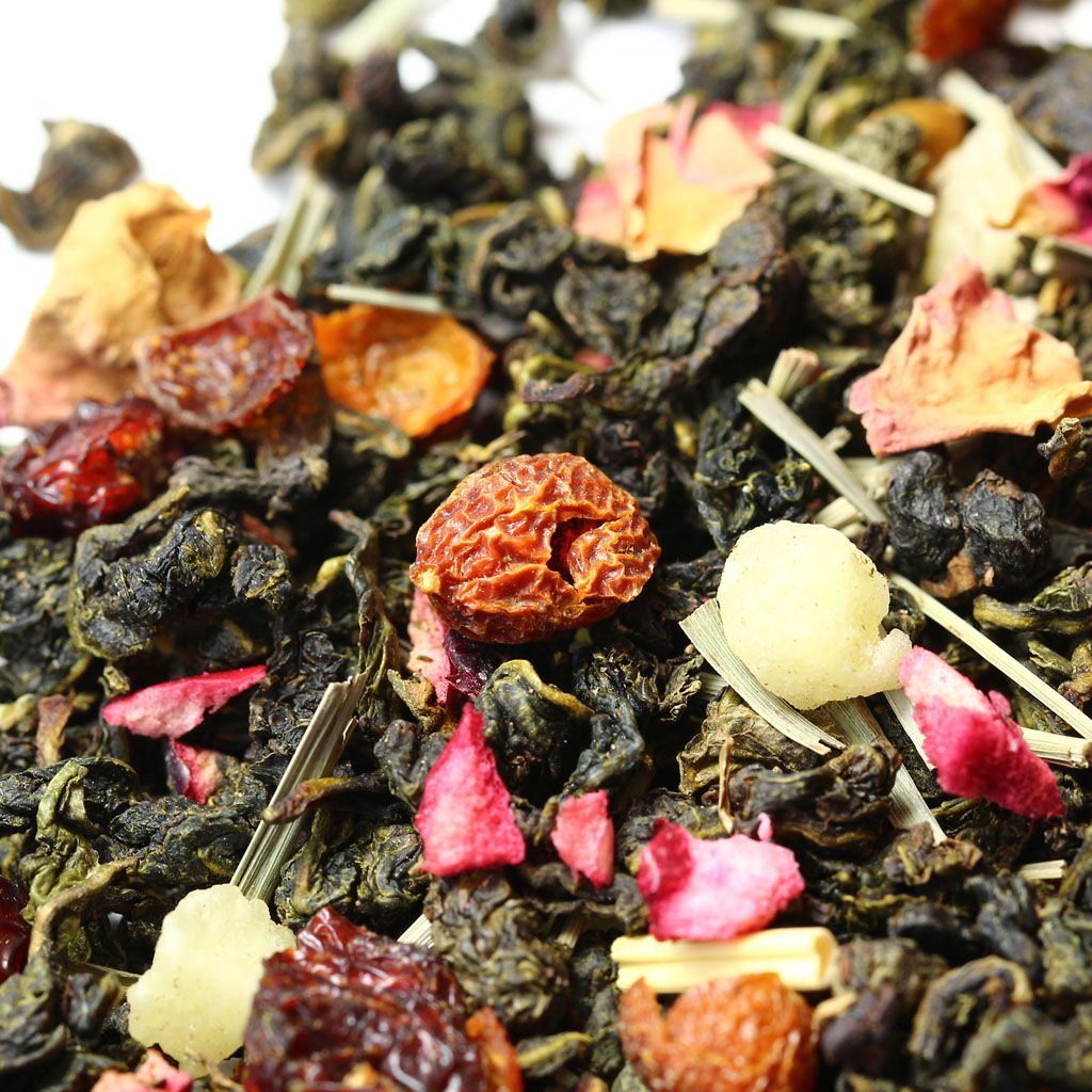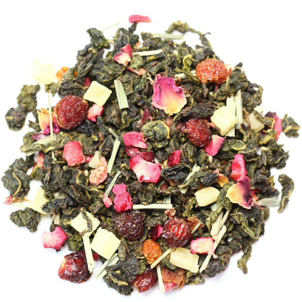 Китайский чай улун, кусочки ананаса, шиповник измельченный, лемонграсс, кусочки клюквы, лепестки розы, аромат земляники и черимойи.