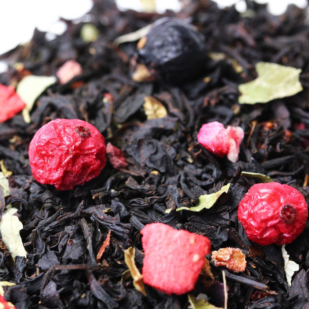 Чай черный индийский, ягоды черной смородины, ягоды красной смородины, кусочки клюквы, кусочки клубники, листья смородины, аромат черной смородины и дикой вишни.