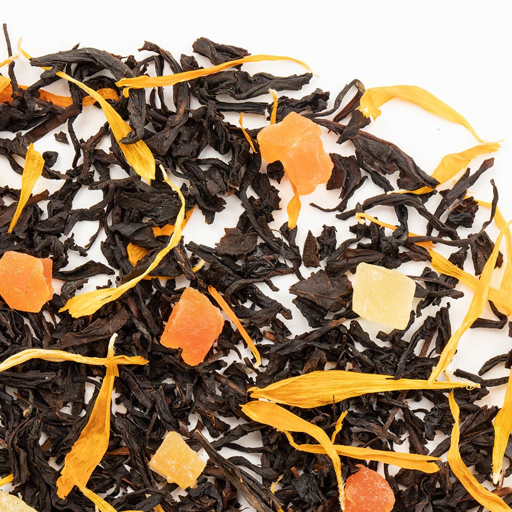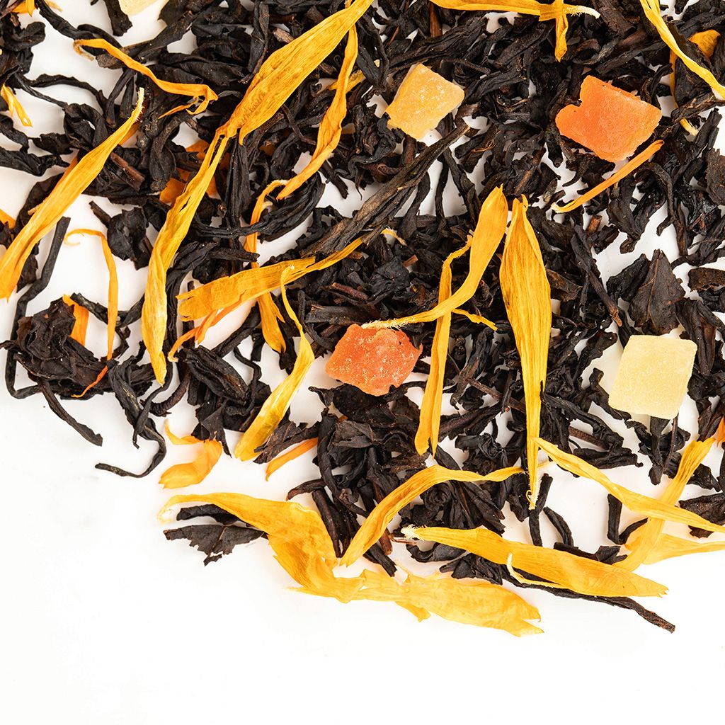 Прекрасный вкус и неповторимый аромат дарит чаю гармоничное сочетание черных чаев из солнечной Индии, кусочков папайи и ананаса из жарких тропиков, лепестков календулы из широт с умеренным климатом. Приятное впечатление от композиции создается и благодаря аппетитному желто-оранжево-черному оттенку сухой смеси. Акцент вкуса делается на тропических фруктах, дарящих напитку неповторимую сладость и фруктовое послевкусие. Дурманящий аромат саусепа и манго отлично вписывается в созданный коктейль. Напиток прекрасно расслабляет, поднимает настроение. Глубокий янтарный оттенок отлично сочетается с пряным ароматом, а терпко-сладкий вкус только дополнит эту красоту. Состав: Чай черный индийский, кусочки ананаса, кусочки папайи, лепестки календулы, аромат тропических фруктов. Количество чая: 2 чайные ложки Объем и температура воды: 450 мл., 90-98 С Время заваривания: 2-5 минут