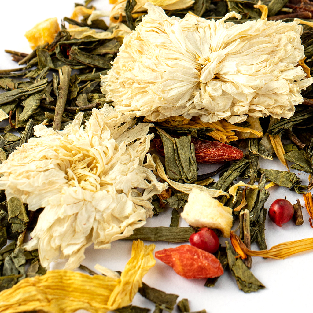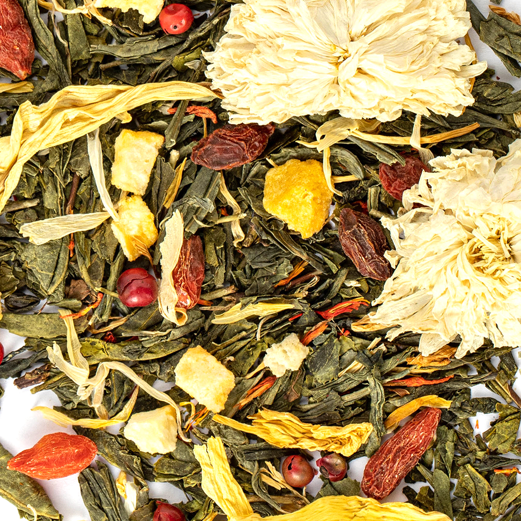 Сказки Персии — утончённый зелёный чай на основе сенчи с восточным характером. Сочная сладость персика и ягод годжи мягко раскрывается на фоне свежих цитрусовых нот лайма, а ваниль придаёт вкусу бархатную глубину. Цветочные акценты и лёгкая пряность розового перца создают тёплую, сказочную атмосферу, словно глоток из мира восточных легенд. Состав: сенча, ягоды годжи, кусочки персика, хризантема, лепестки подсолнуха, перец Розовый горошек, аромат ванили и лайма