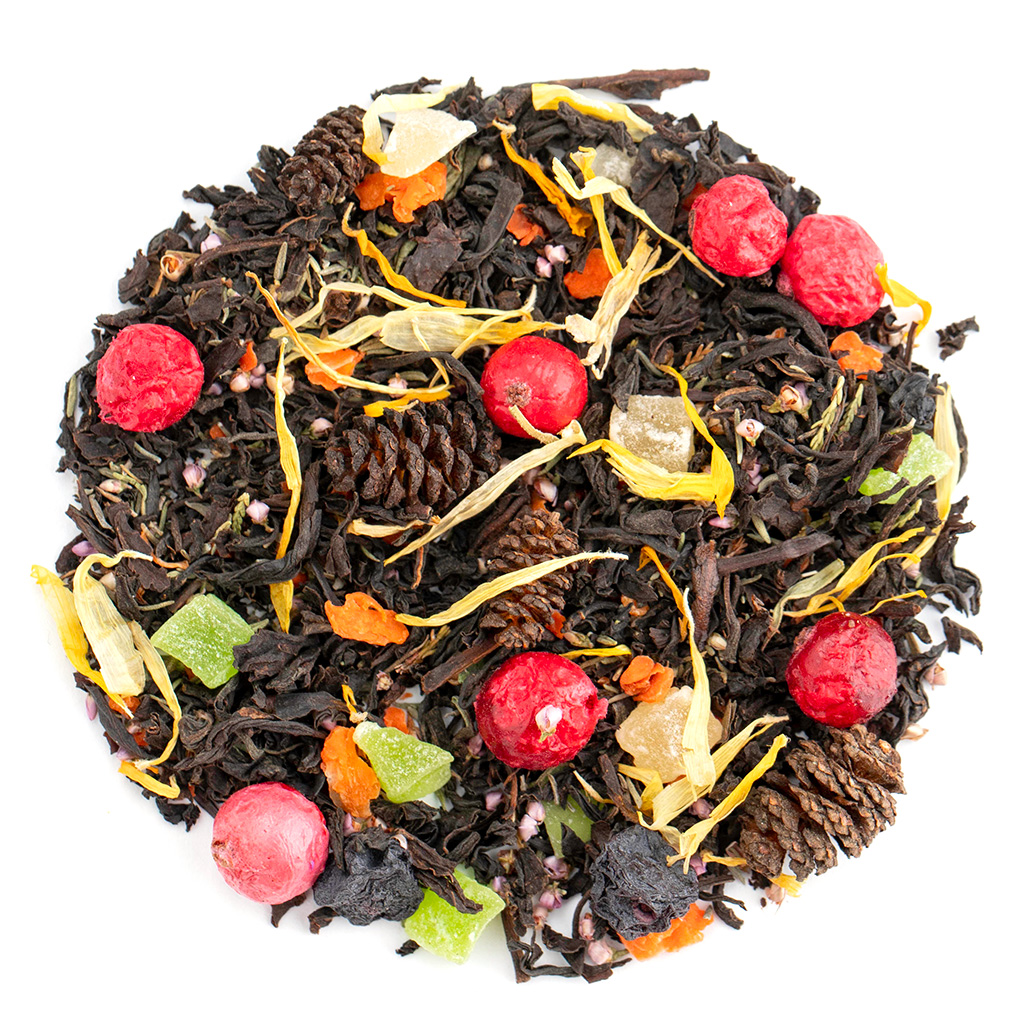 Состав чай черный индийский, цукаты ананаса, кусочки моркови, шишки ольхи, чабрец, ягоды голубики, ягоды красной смородины, вереск, лепестки календулы, аромат лесных ягод