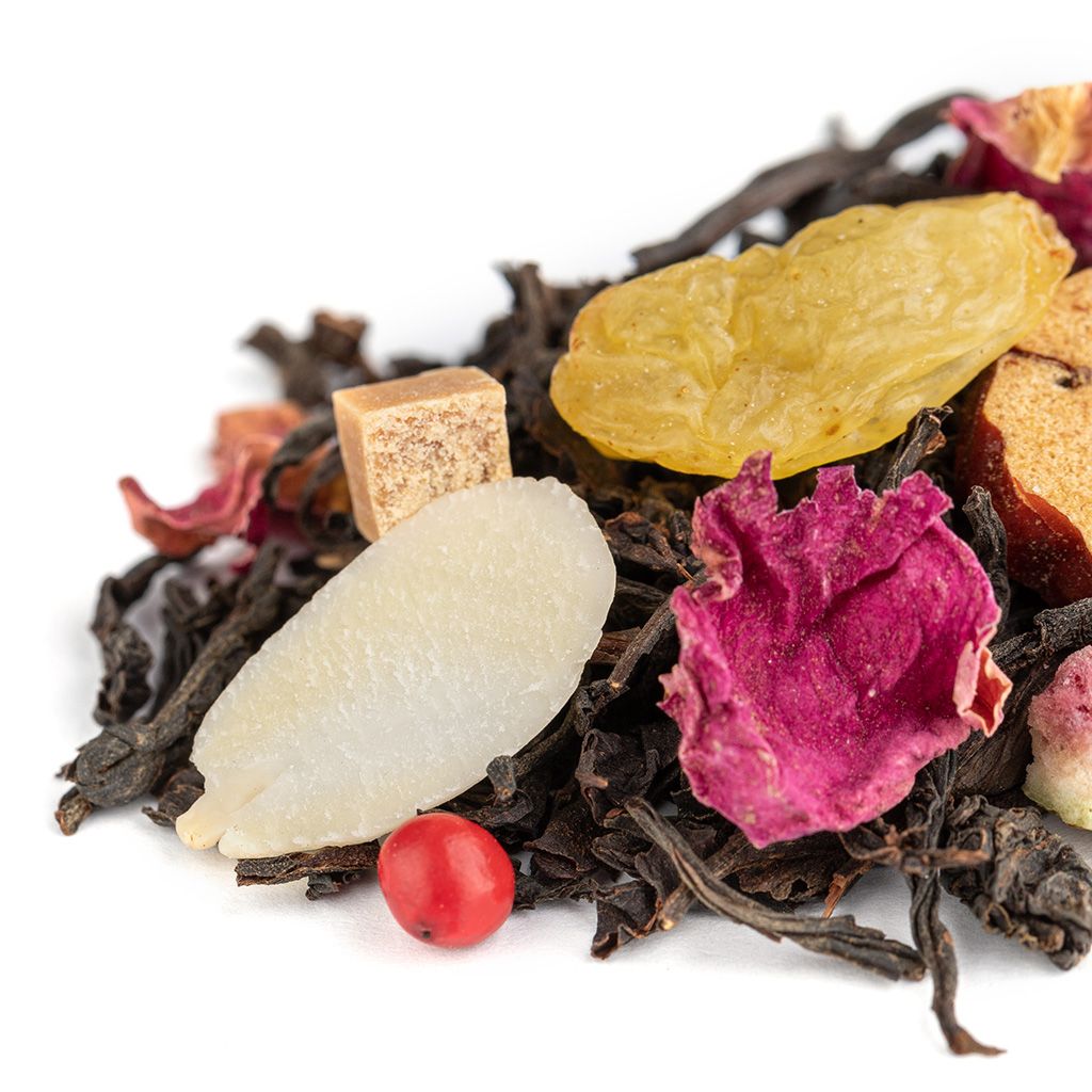 Состав: Чай черный индийский, изюм, карамель кусочки, инжир, миндаль лепестки, финик, роза лепестки, перец розовый, аромат "Восточные сладости".
