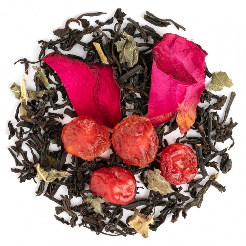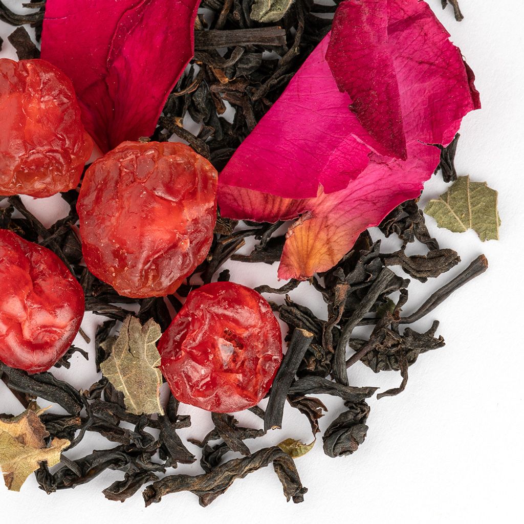 Чай черный индийский, ягоды вишни, кусочки клюквы, лепестки розы, листья смородины, аромат вишни с ромом.