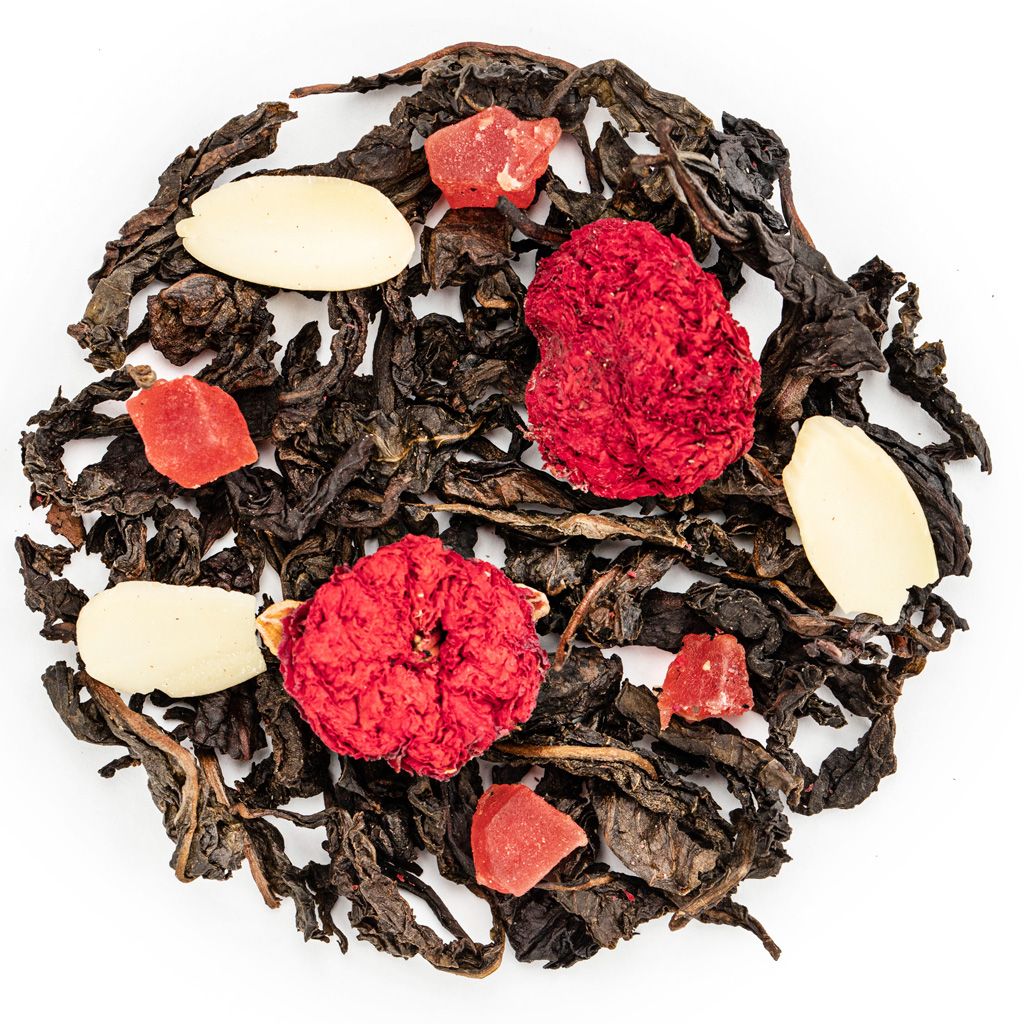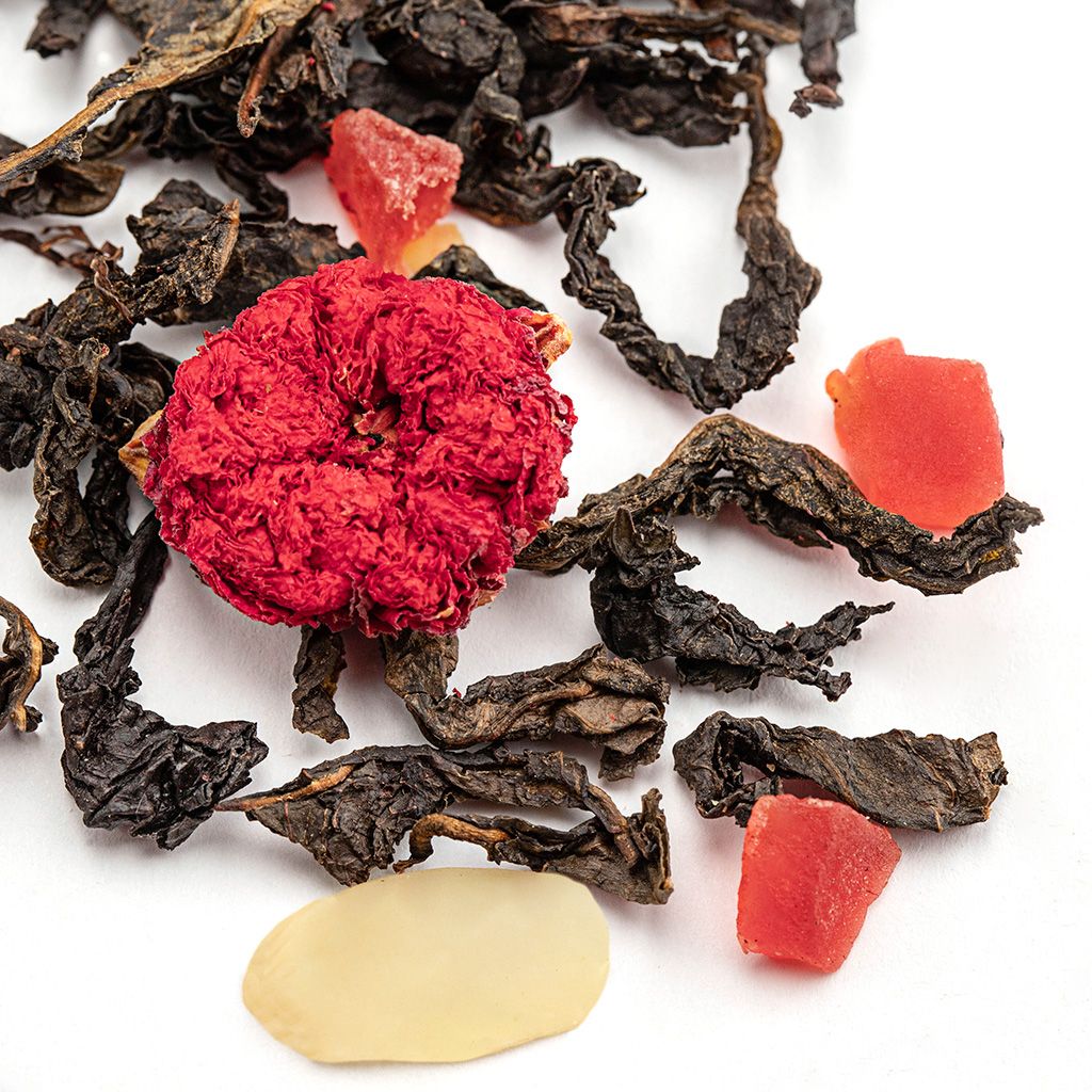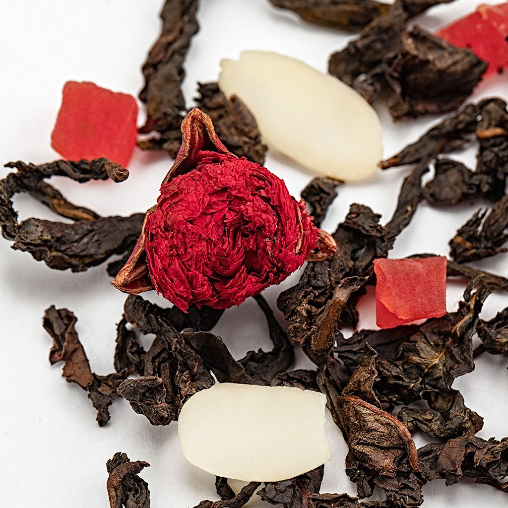 Роскошный купаж на основе легендарного чая Да Хун Пао. Состав Да Хун Пао (Большой красный халат), кусочки ананаса, цветы граната, лепестки миндаля, аромат Карамельный ликер