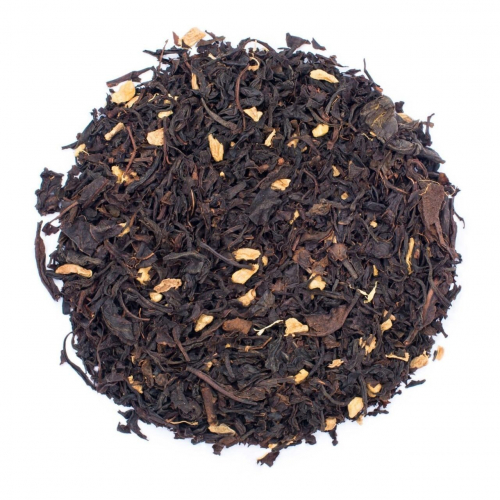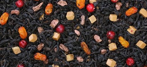 Черный индийский чай с кусочками молочной карамели и какао бобов, ягод облепихи и брусники с ароматом молочного шоколада со сливками и ванилью.
