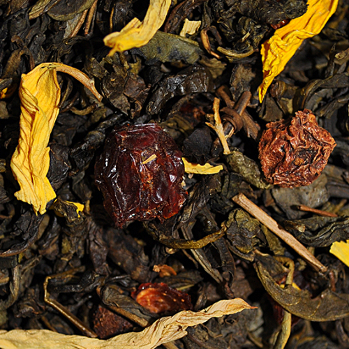 Высокогорный зеленый чай с добавлением кожуры шиповника и лепестков подсолнечника.