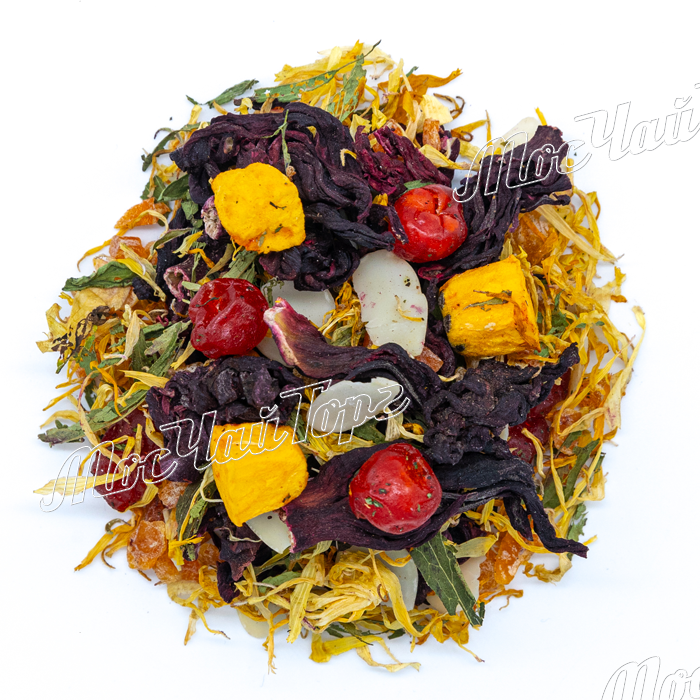 Бутоны каркаде, сушенная маракуйя, кусочки абрикоса, лепестки миндаля, сушенная вишня, календула, листья стевии, ароматизатор.