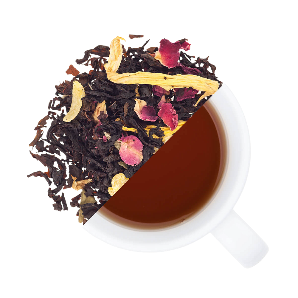 НЕОБЫКНОВЕННОЕ ИГРИВОЕ СОЧЕТАНИЕ ИЗ ЧЕРНОГО ИНДИЙСКОГО ЧАЯ, НЕЖНЕЙШИХ ЛЕПЕСТКОВ РОЗЫ, ПОДСОЛНЕЧНИКА И РУБЛЕННОГО АНАНАСА.